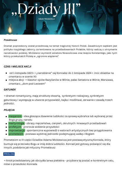 Zawiera najważniejsze informacje o treści, bohaterach i przesłaniu utworu. Idealna pomoc przed sprawdzianem, kartkówką lub odpowiedzią ustną.
