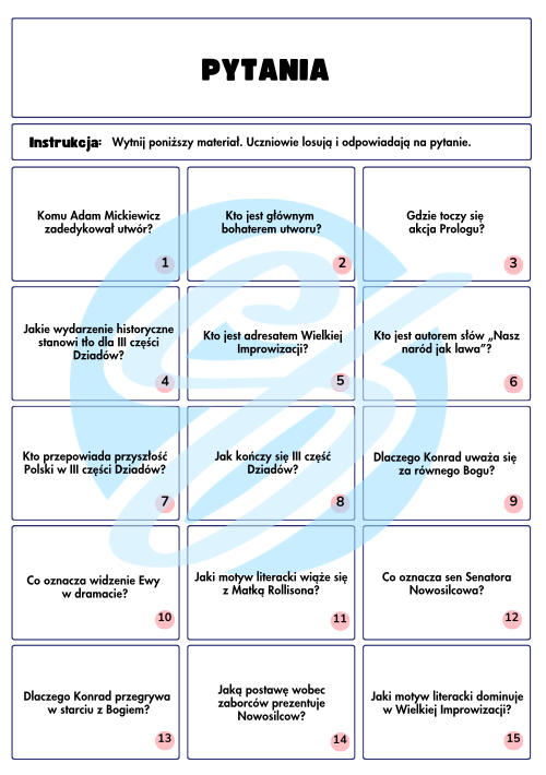 🔎 Przygotowujesz uczniów do matury z języka polskiego? A może szukasz gotowych pytań do kartkówki lub powtórki przed sprawdzianem? Ten zestaw 15 pytań i odpowiedzi pomoże w szybkim i skutecznym utrwaleniu wiedzy z III części Dziadów Adama Mickiewicza.
