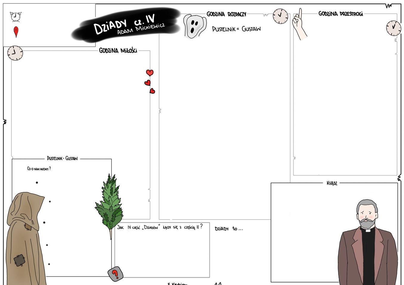 Jedna karta w formacie pdf w trzech wersjach (pustej, kolorowej i uzupełnionej). Karta pozwala zebrać w jednym miejscu wszystkie niezbędne informacje dotyczące czwartej części "Dziadów". Stanowi świetny materiał powtórkowy przed maturą.