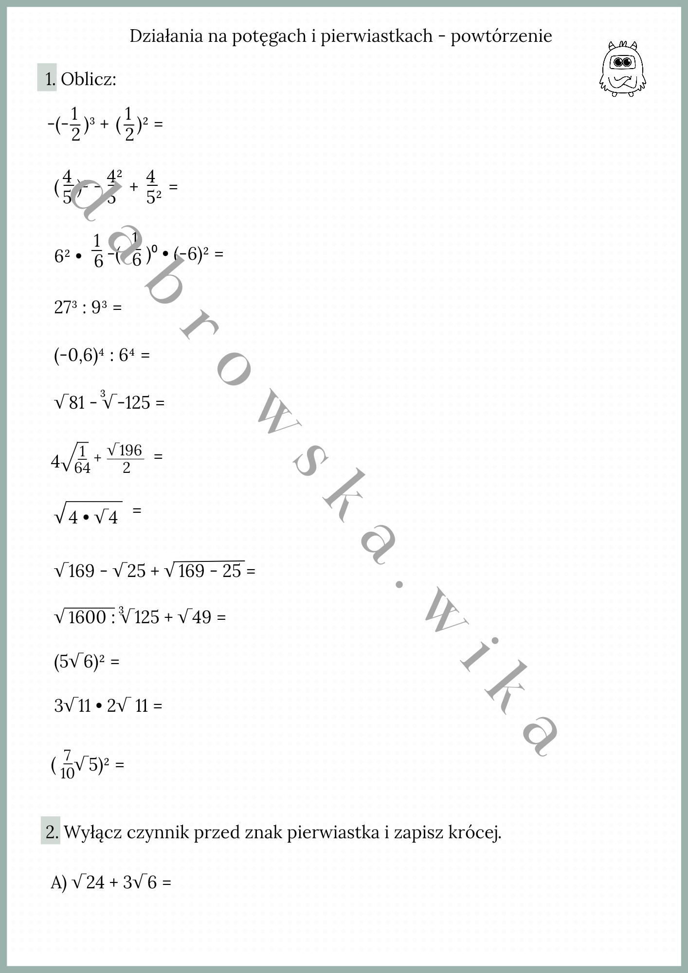 Materiał zawiera zestaw trzynastu zadań powtórkowych z działań na potęgach i pierwiastkach.