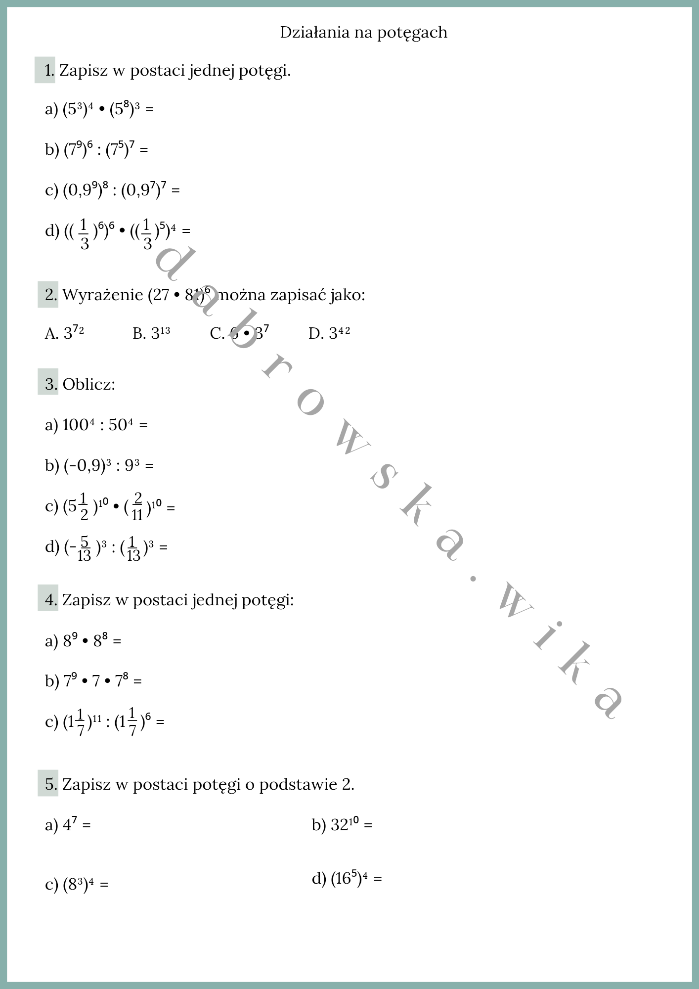 Materiał zawiera zestaw szesnastu zadań dotyczących działań na potęgach.