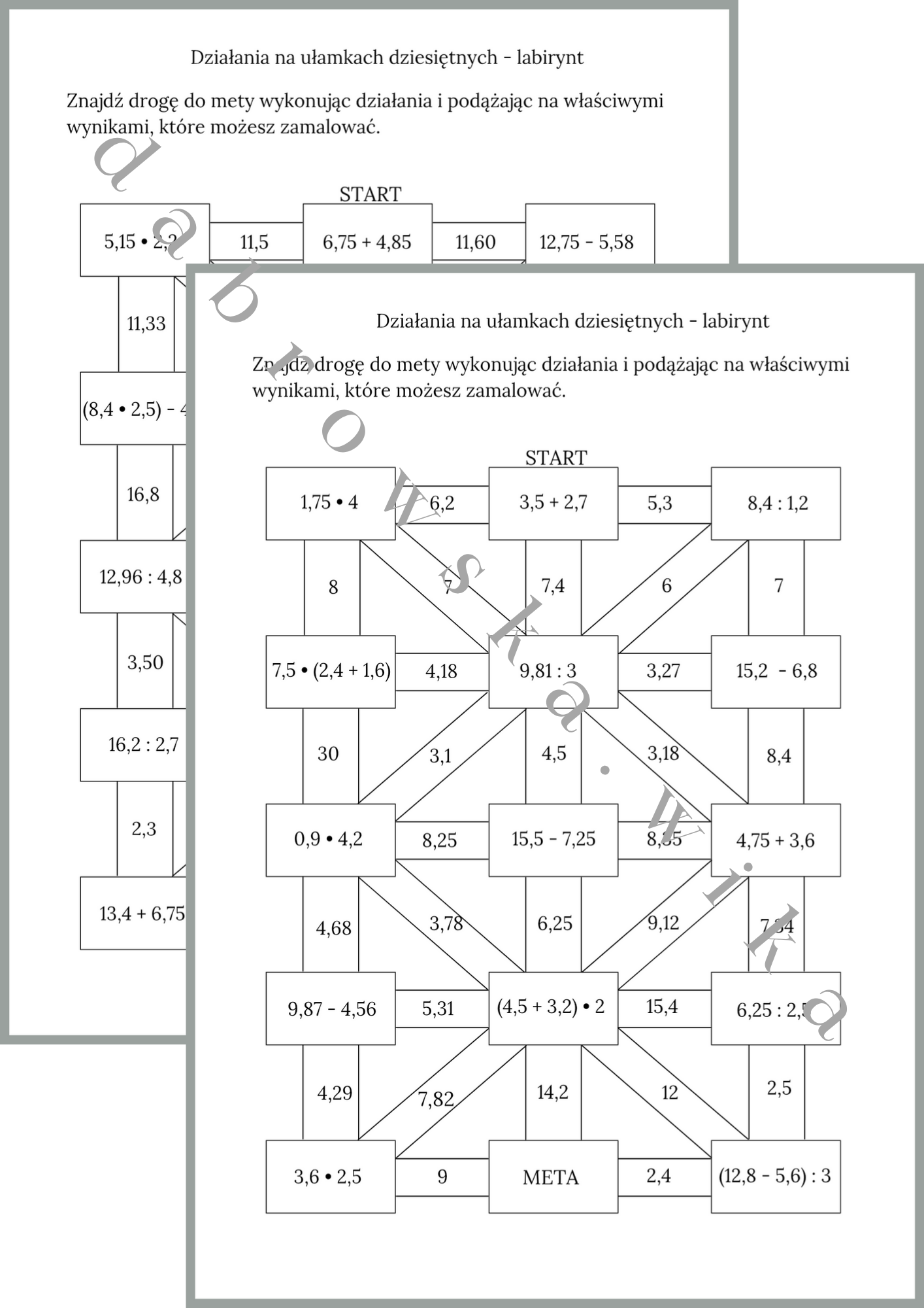 Materiał zawiera dwie wersje labiryntu matematycznego dotyczącego działań na ułamkach dziesiętnych.