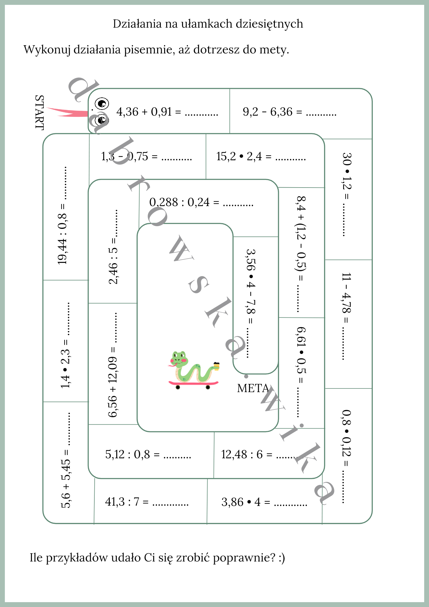 Karta pracy jest stworzona w ciekawej formie — węża matematycznego z działaniami: dodawanie, odejmowanie, mnożenie i dzielenie ułamków dziesiętnych.