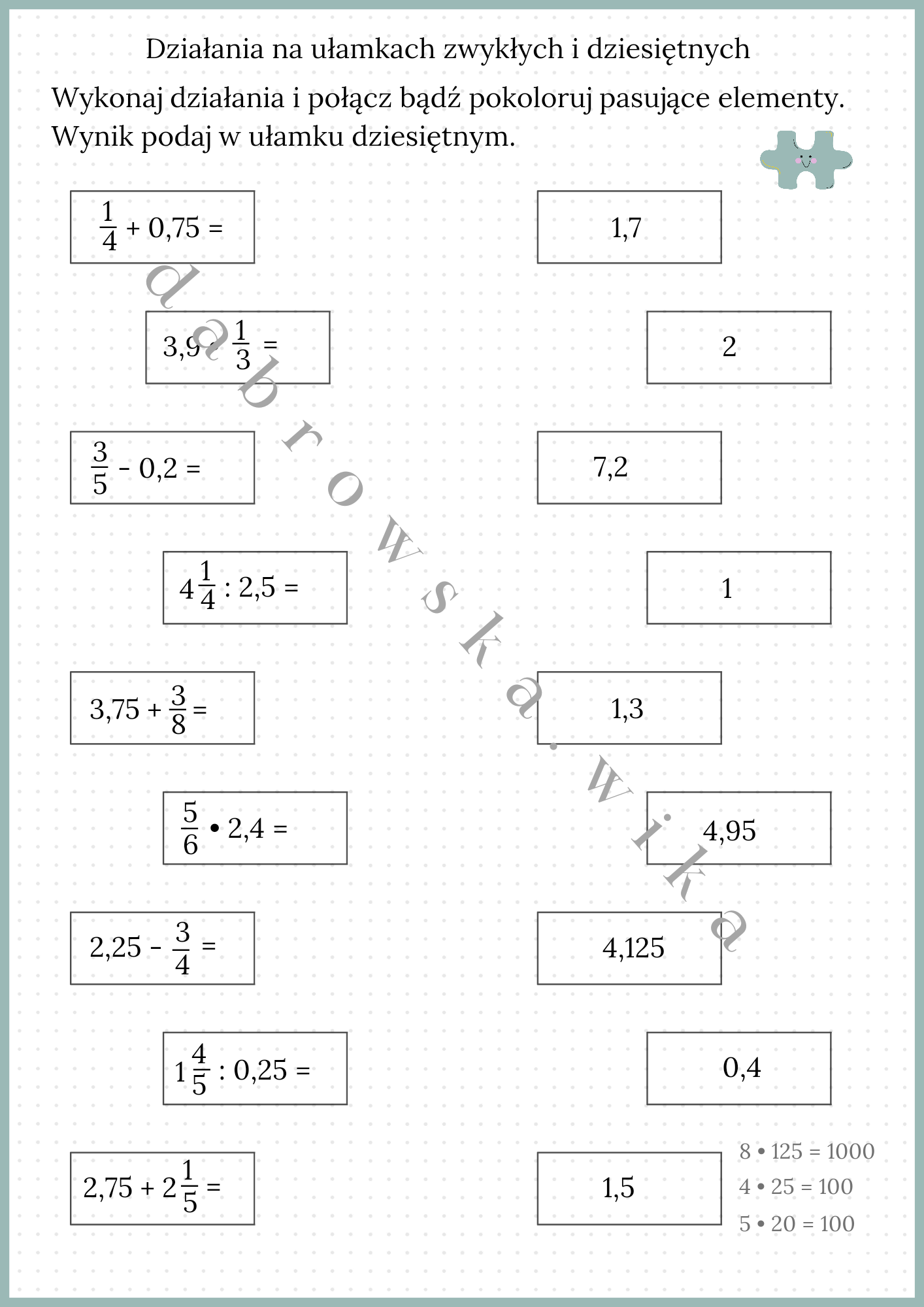 Materiał zawiera kartę pracy z tematu działania na ułamkach zwykłych i dziesiętnych.