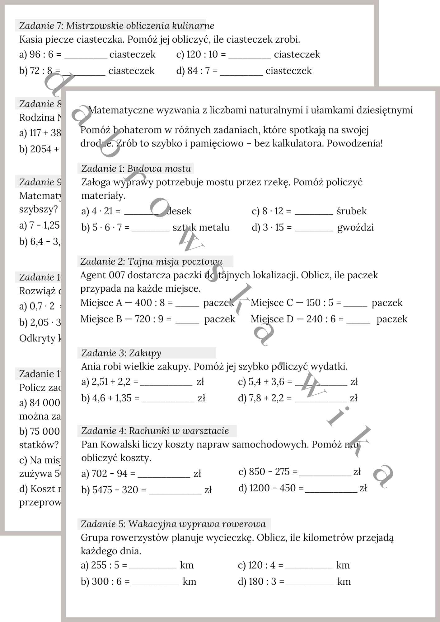 Na ucznia czeka jedenaście różnorodnych wyzwań w których musi zmierzyć się z dodawaniem, odejmowaniem, mnożeniem i dzieleniem liczb naturalnych oraz ułamków dziesiętnych.