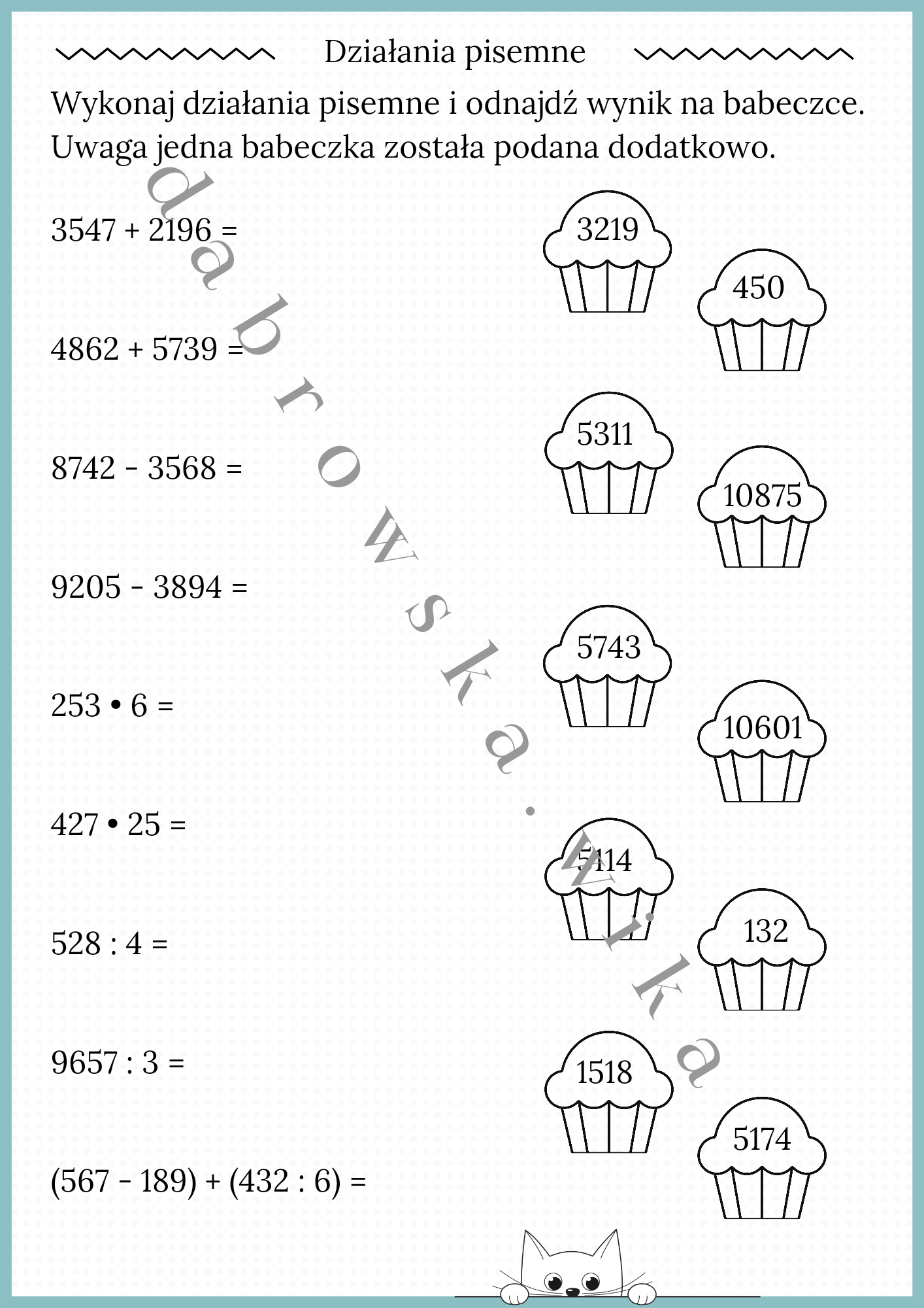 Zadaniem ucznia jest rozwiązać osiem działań pisemnych i połączyć (bądź pokolorować) z odpowiednim wynikiem na babeczce.