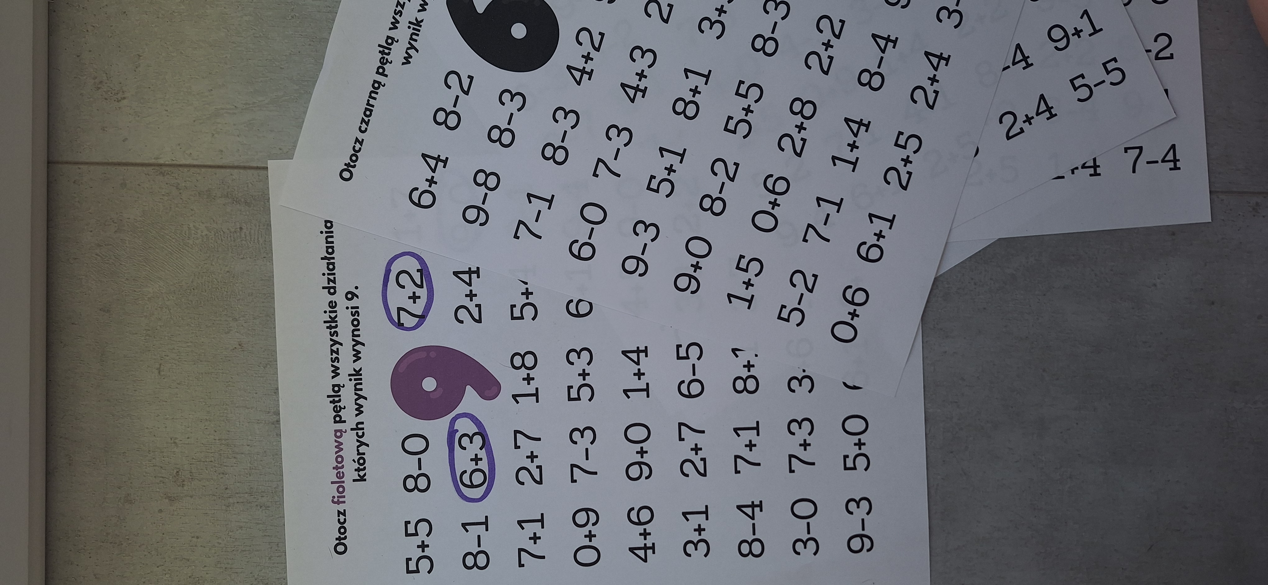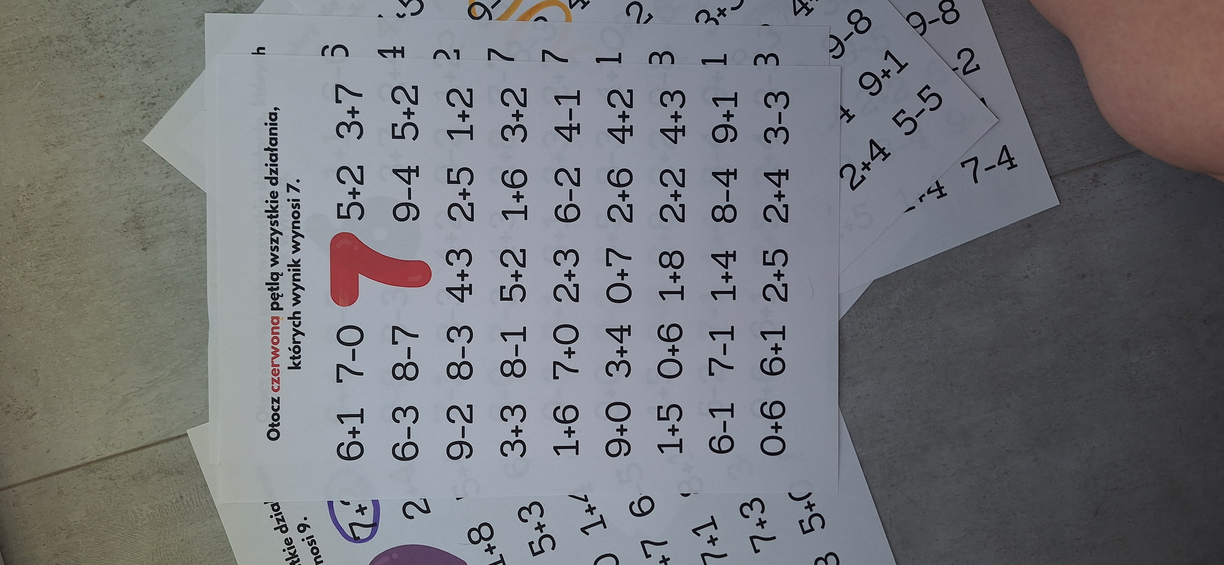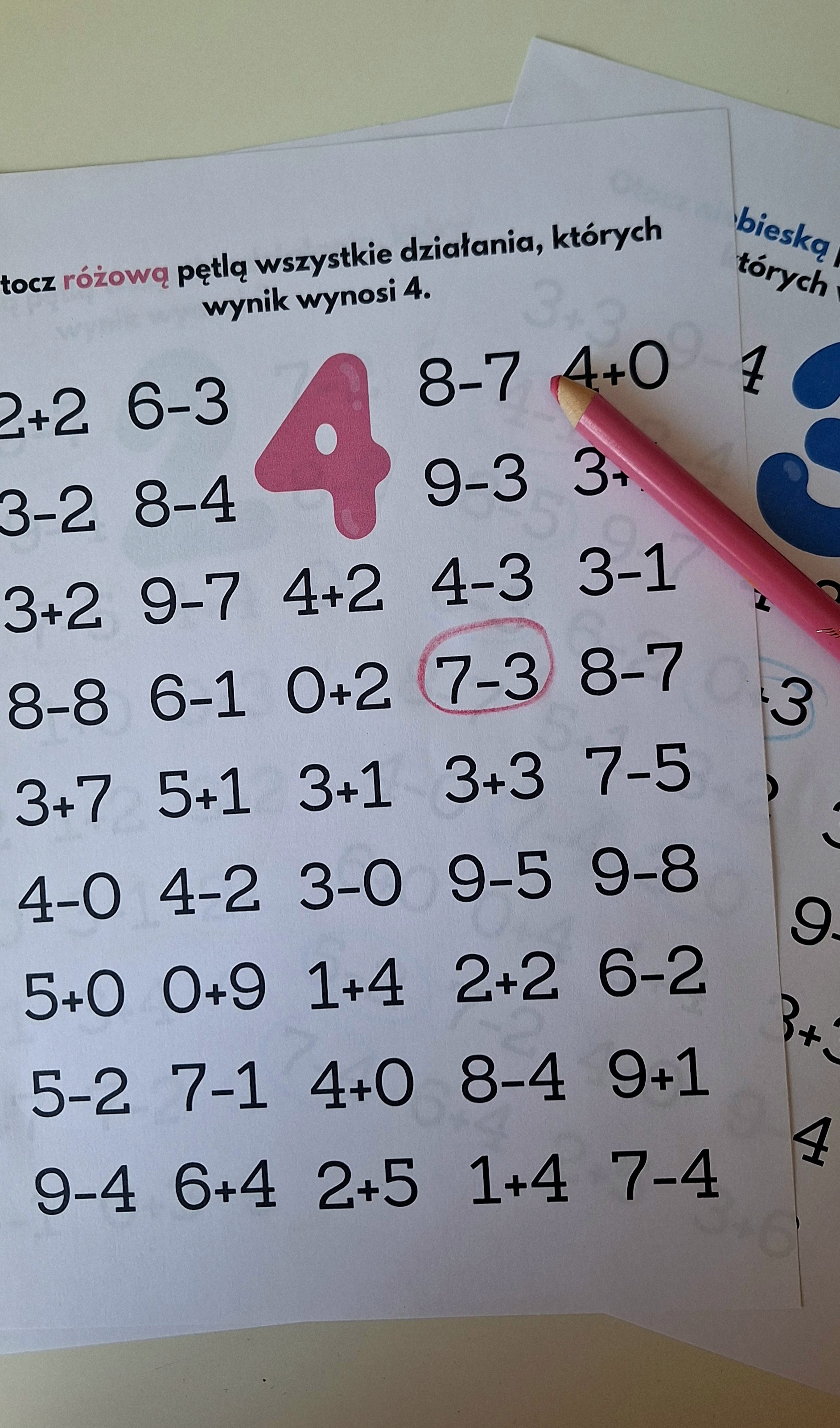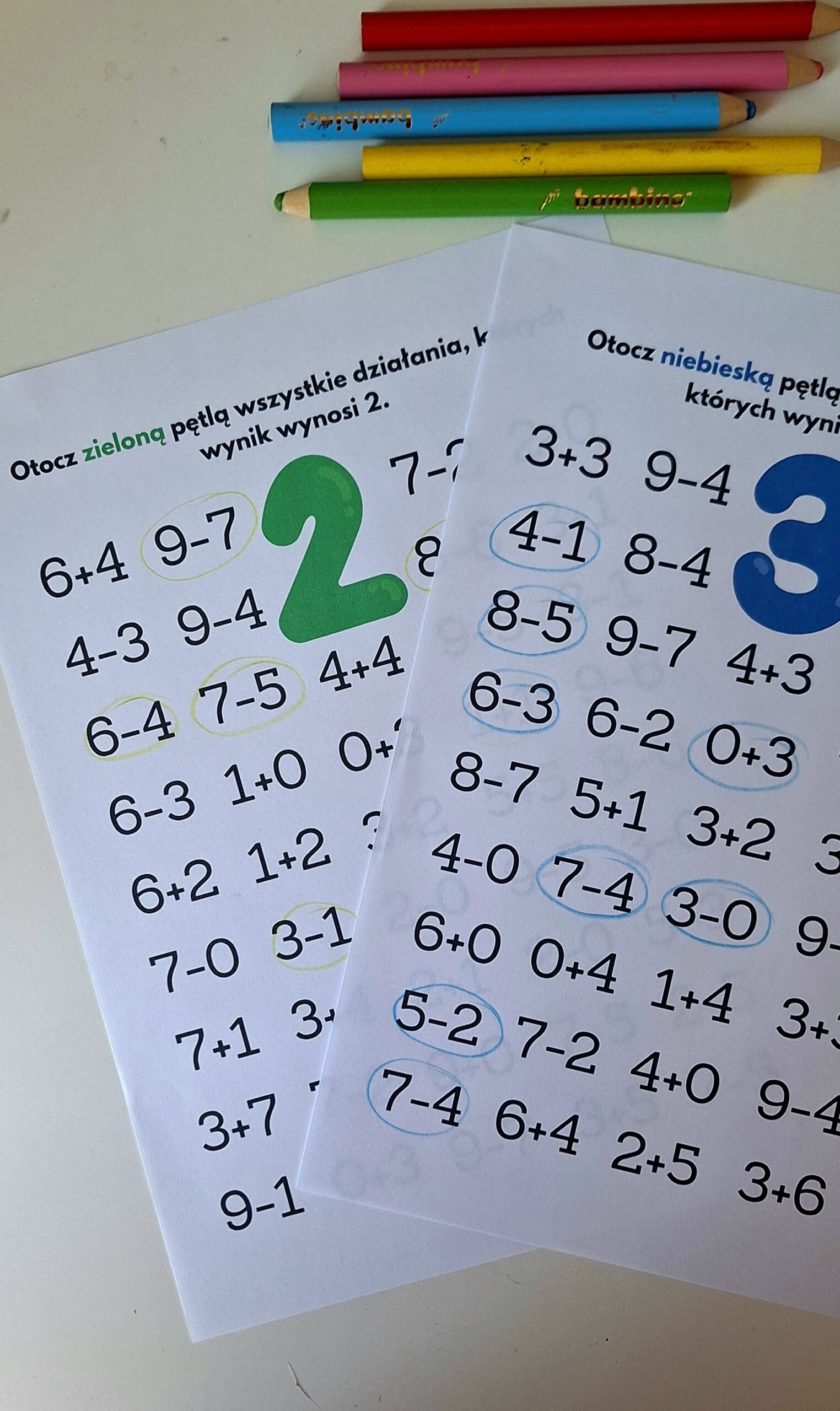 Zadaniem dziecka jest otoczenie pętlą tych działań, których wynik wynosi tyle samo, co kolorowa cyfra na karcie 😊