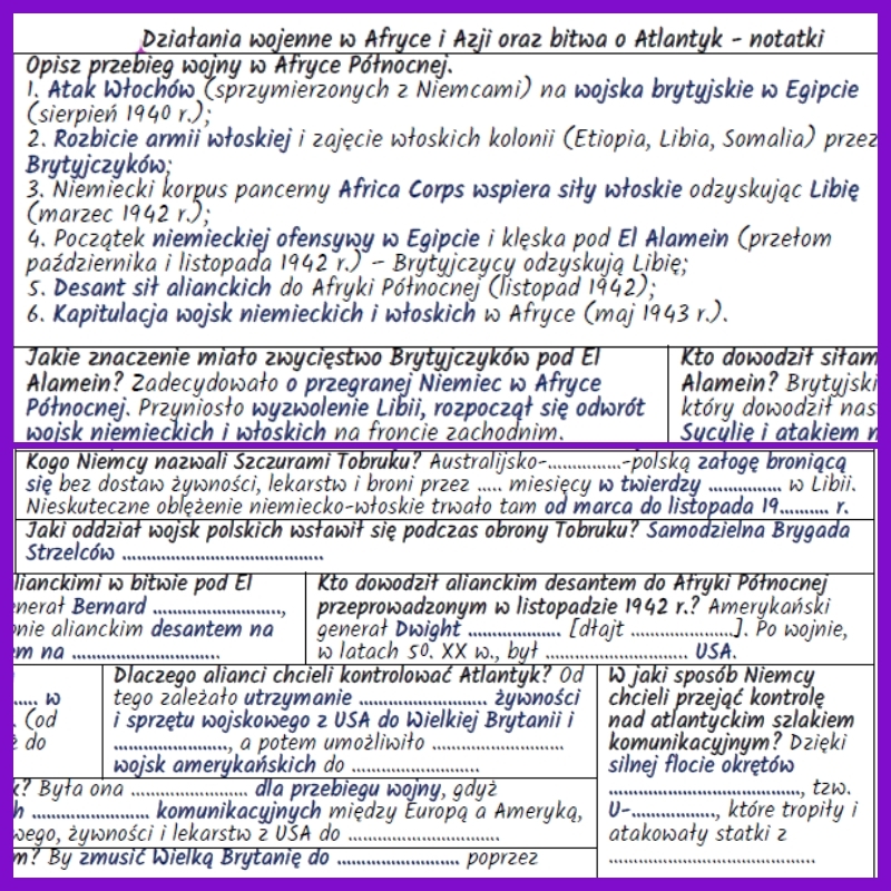 Notatki w formie pytań i odpowiedzi dotyczące działań wojennych w północnej Afryce i na Oceanie Atlantyckim oraz podbojów japońskich w Azji i wojny amerykańsko-japońskiej na Pacyfiku, przygotowane dla klasy 8 według podstawy programowej nauczania historii w szkole podstawowej (Podstawa programowa – Historia – Szkoła podstawowa IV-VIII) oraz utrwalająca wiedzę karta pracy zawierająca luki w treści wymagające uzupełnienia ustnego lub pisemnego.