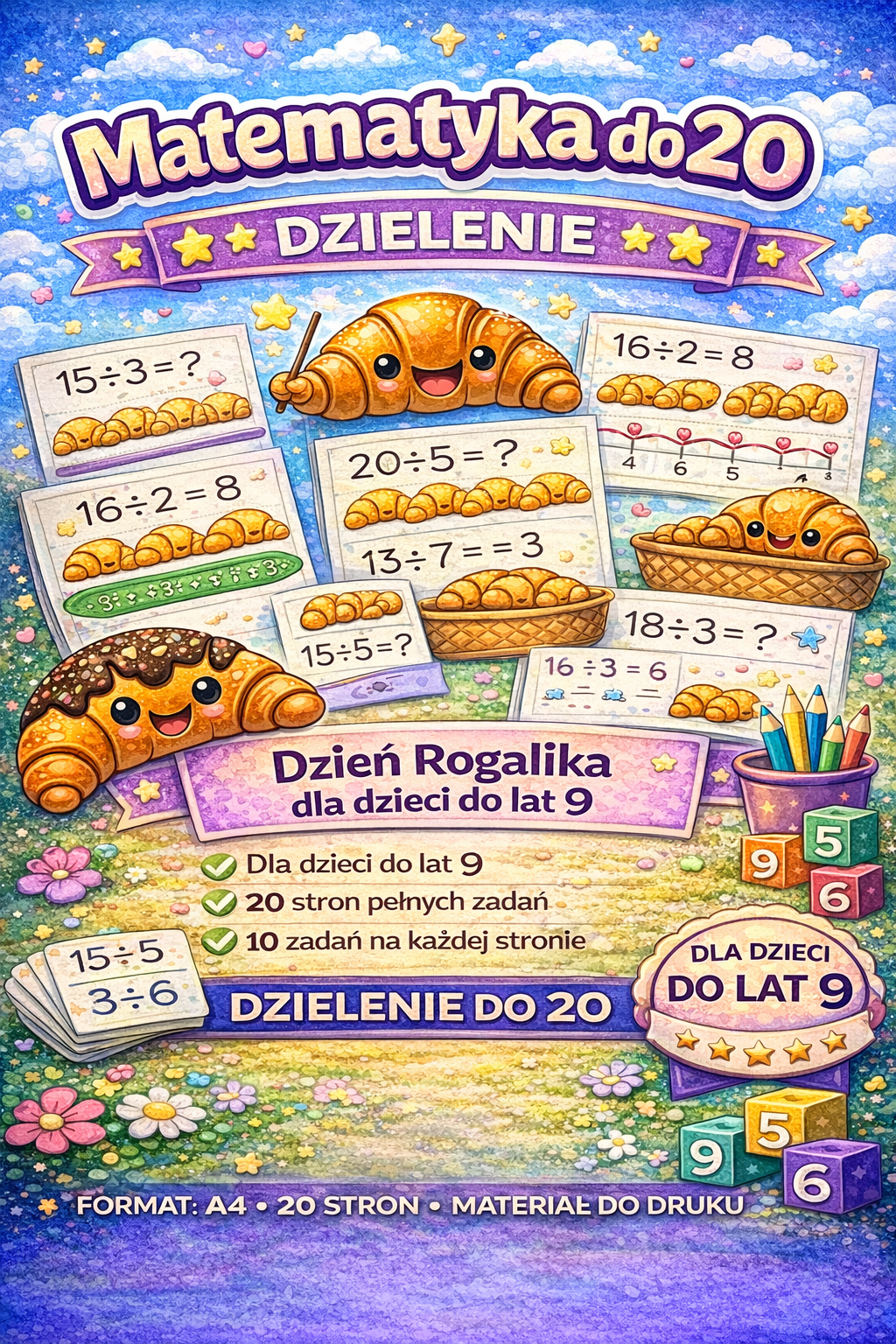 „Dzielenie do 20 – Dzień Rogalika”** to kolorowy zestaw kart pracy w formacie A4 dla dzieci do 9 lat. Zawiera **20 stron** i **10 różnorodnych zadań na każdej stronie**, które pomagają utrwalić **dzielenie w zakresie do 20** w rogalikowym, zabawnym klimacie. Idealny materiał do druku na lekcje, zajęcia dodatkowe i pracę w domu. 🥐✨