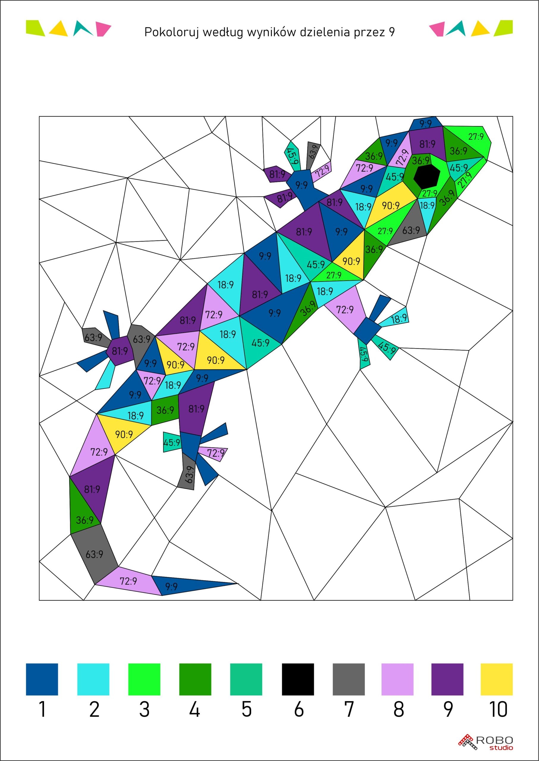 Dzielenie przez 9 - kolorowanka według wyników dzielenia, nauka mnożenia i dzielenia