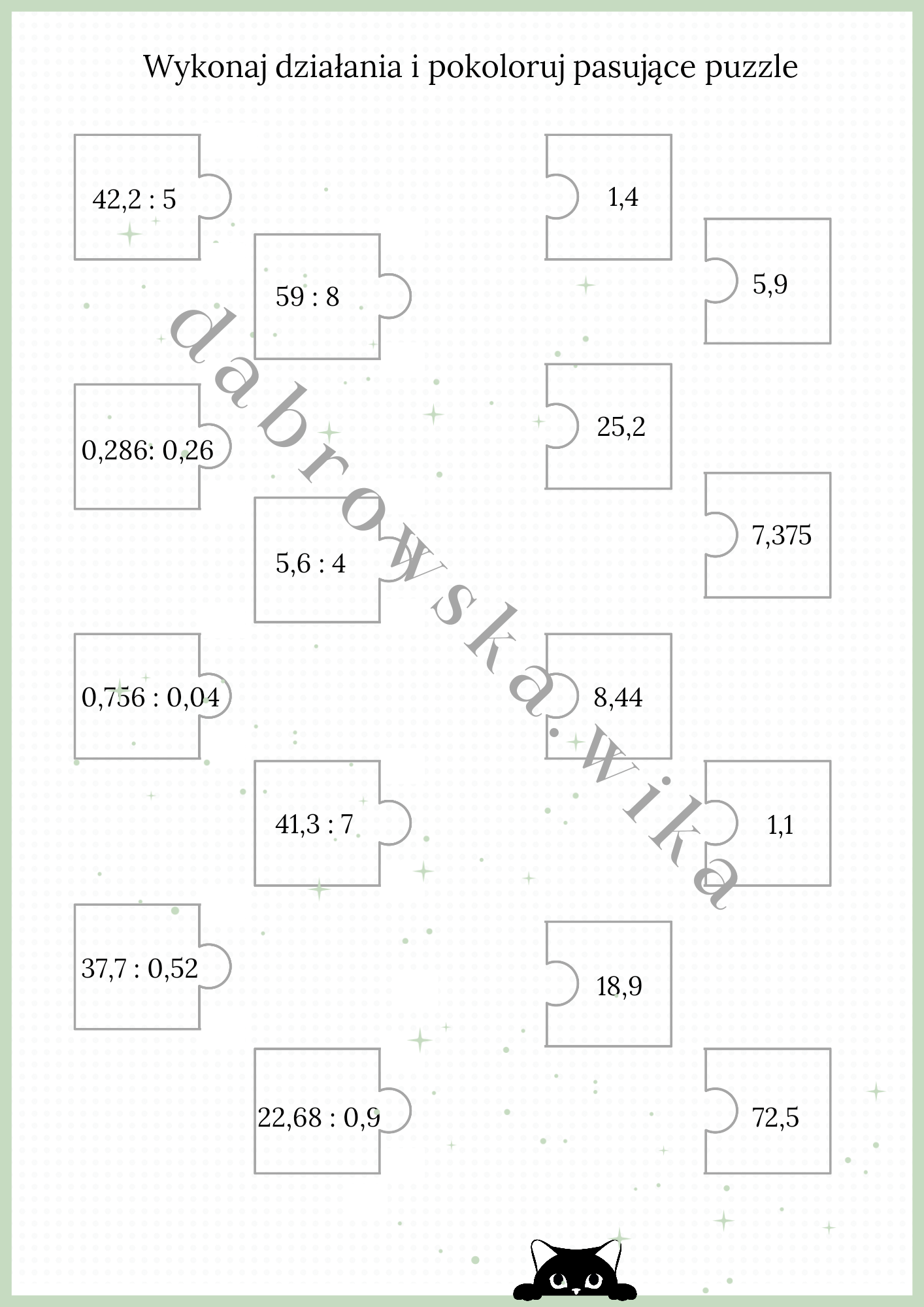 Na ucznia czeka osiem przykładów do rozwiązania, a następnie pokolorowanie pasujących do siebie puzzli (działanie-wynik).