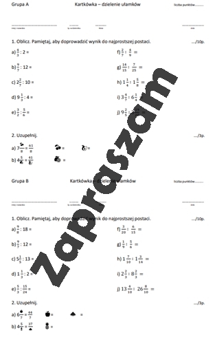 Dzielenie ułamków zwykłych - kartkówka / karta pracy