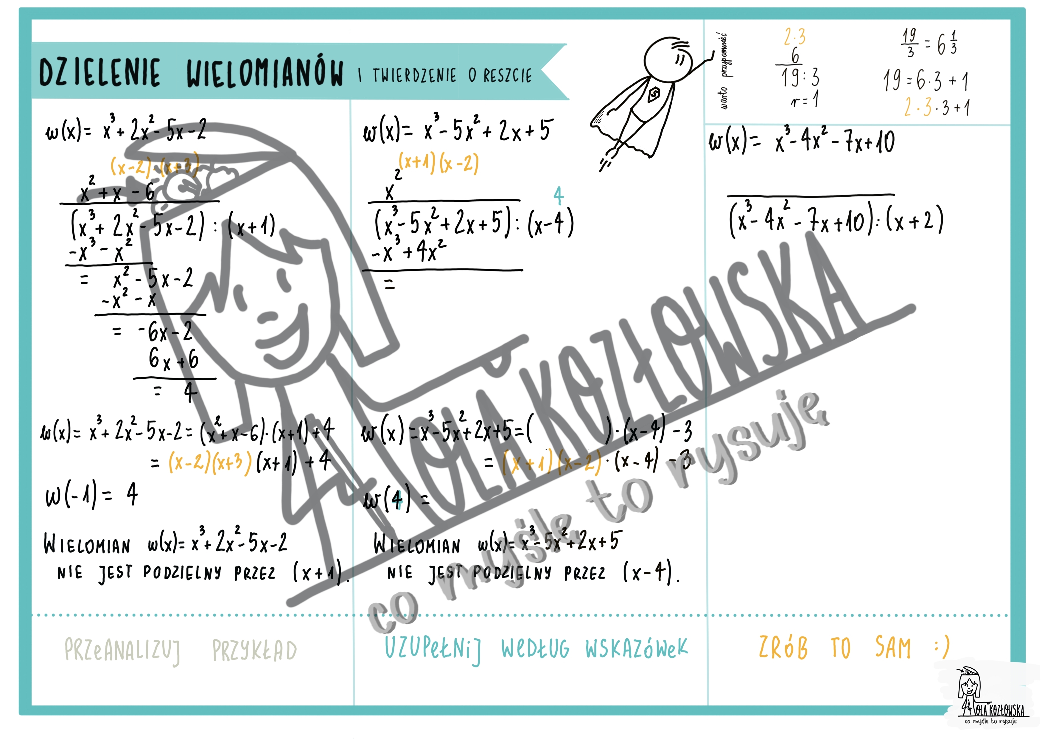 Karta pracy (modelowanie matematyczne) do elementarnych umiejętności związanych z dzieleniem wielomianów i twierdzeniem o reszcie (3 przykłady - do analizy, ze wskazówkami i do samodzielnego rozwiązania).