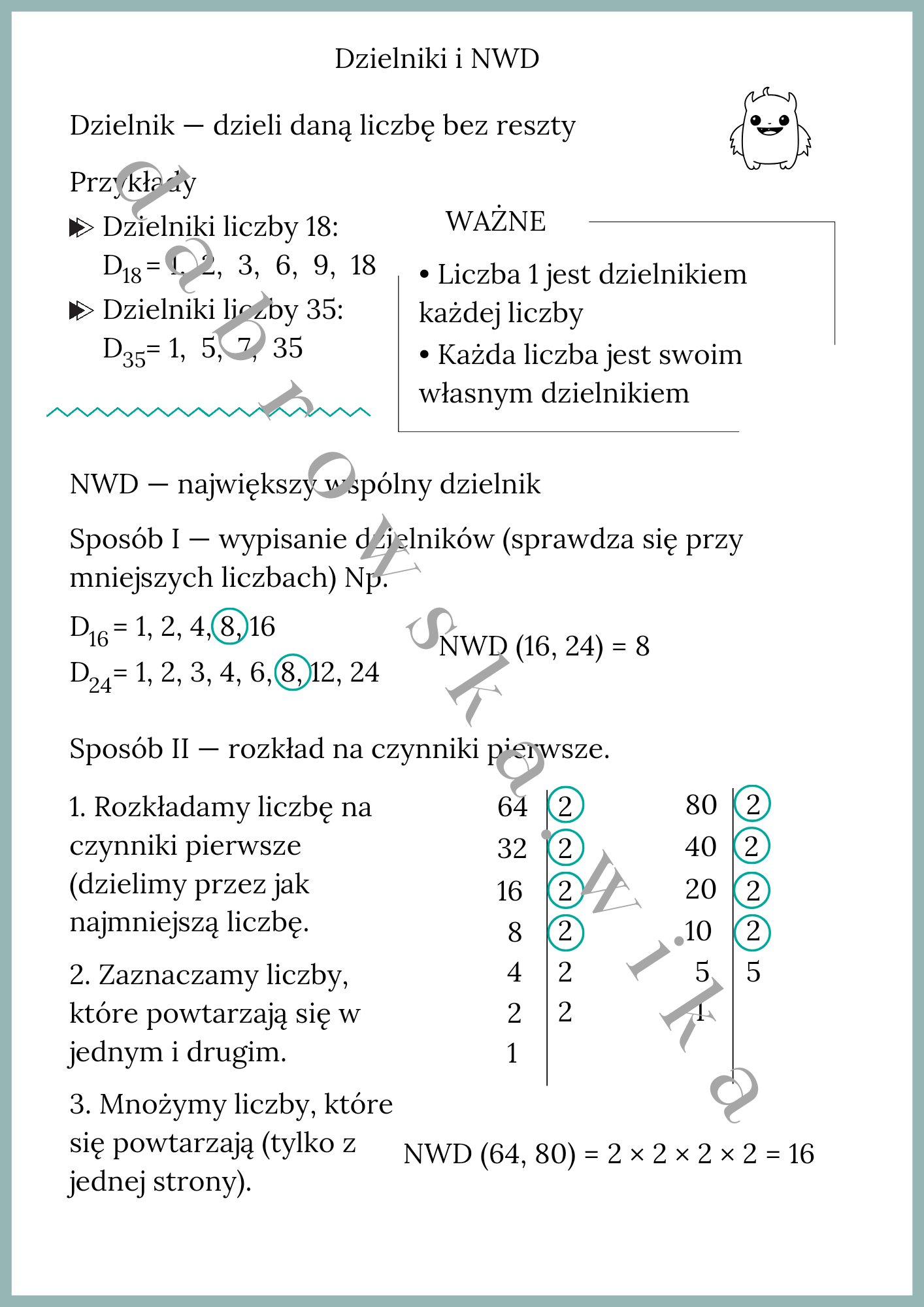 Materiał zawiera notatkę dotyczącą dzielników i największego wspólnego dzielnika (NWD).