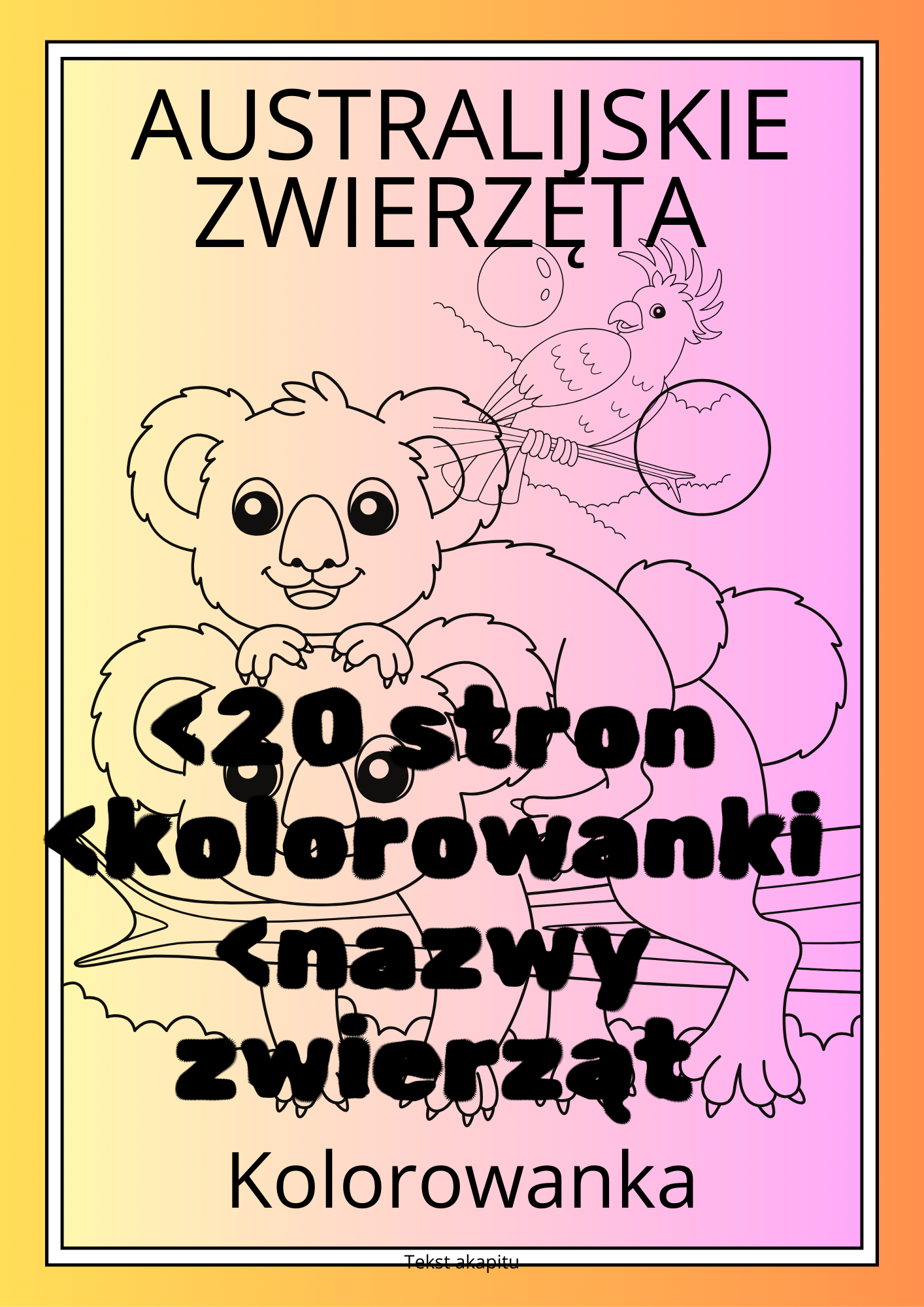 Materiał to **20-stronicowa kolorowanka „Australijskie zwierzęta”**, w której każda strona przedstawia **jedno zwierzę charakterystyczne dla Australii**. Są to m.in.: koala, kakadu, dingo, , rekin lamparci, kolczatka, diabeł tasmański, wombat, wieloryb humbak, wąż brunatny oraz krokodyl.