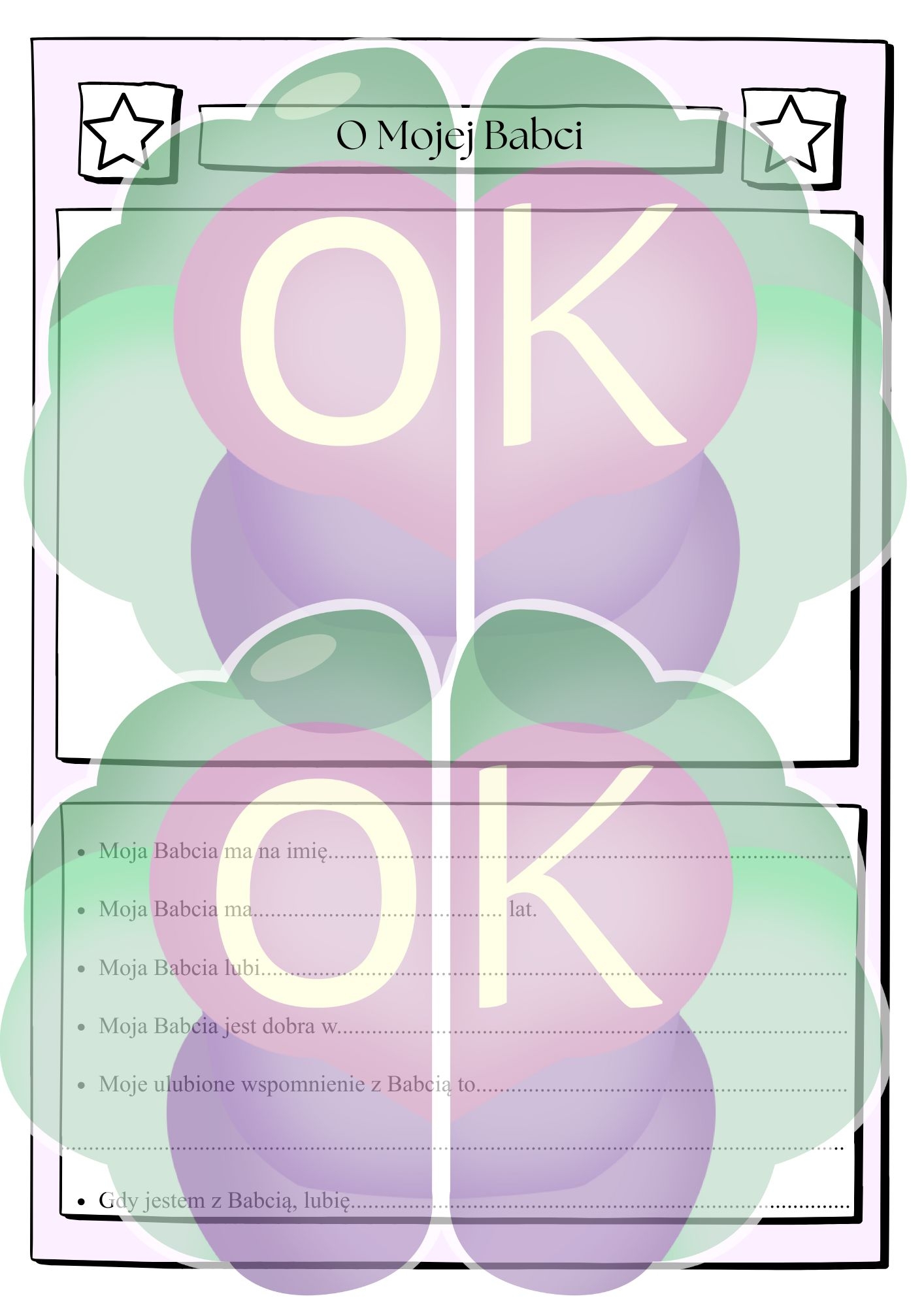 📘 Co zawiera materiał? W zestawie znajdziesz gotowe karty pracy i elementy do druku, które dzieci mogą samodzielnie uzupełniać. 📝 Karta pracy „O mojej babci / O moim dziadku” – dzieci opisują swoich dziadków 🏅 Dyplom dla Babci i Dyplom dla Dziadka ⭐ Order dla Babci i Order dla Dziadka ✏️ Karty z frazami do uzupełnienia: „Mój dziadek jest…” „Moja babcia jest…” „Dziadku, życzę Ci…” „Babciu, życzę Ci…” 🎯 Dlaczego warto? ✔️ rozwija umiejętność wypowiadania się i pisania prostych zdań, ✔️ wzmacnia więzi rodzinne i uczy okazywania uczuć, ✔️ idealny na lekcję wychowawczą, edukację wczesnoszkolną lub zajęcia plastyczne, ✔️ materiał gotowy do druku – zero przygotowań dla nauczyciela.
