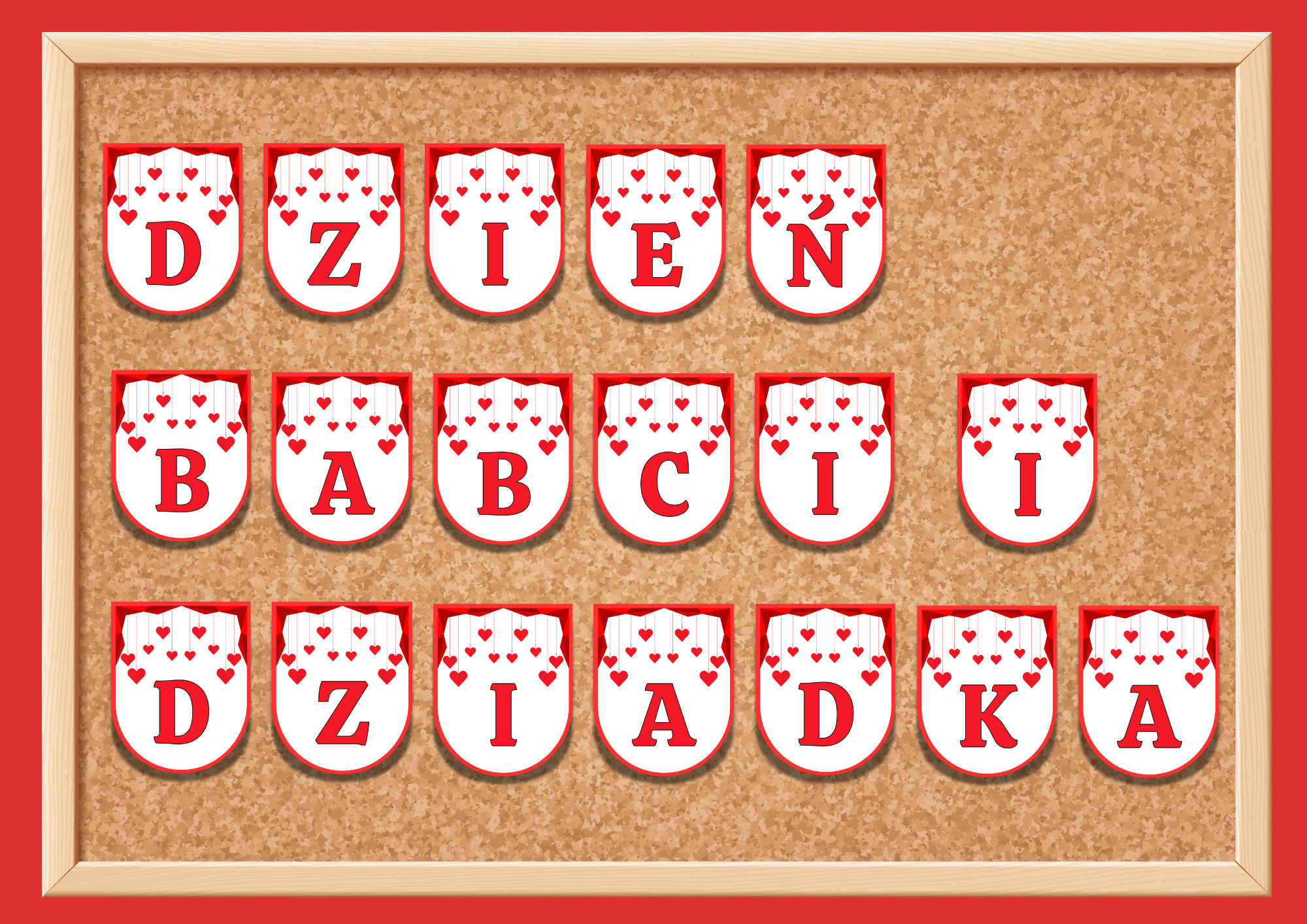 💐 DZIEŃ BABCI I DZIADKA 2 girlandy | PDF A4 Zestaw dwóch dekoracyjnych girland z napisami „DZIEŃ BABCI I DZIADKA” oraz „BABCIU DZIADKU TAK BARDZO WAS KOCHAM” to piękna dekoracja na uroczystość z okazji Dnia Babci i Dziadka. Doskonale sprawdzi się w przedszkolu lub szkole jako ozdoba sali, sceny lub gazetki tematycznej, podkreślając wyjątkowy i rodzinny charakter wydarzenia. Materiał przygotowany jest w formacie PDF A4 i przeznaczony do samodzielnego wydruku.