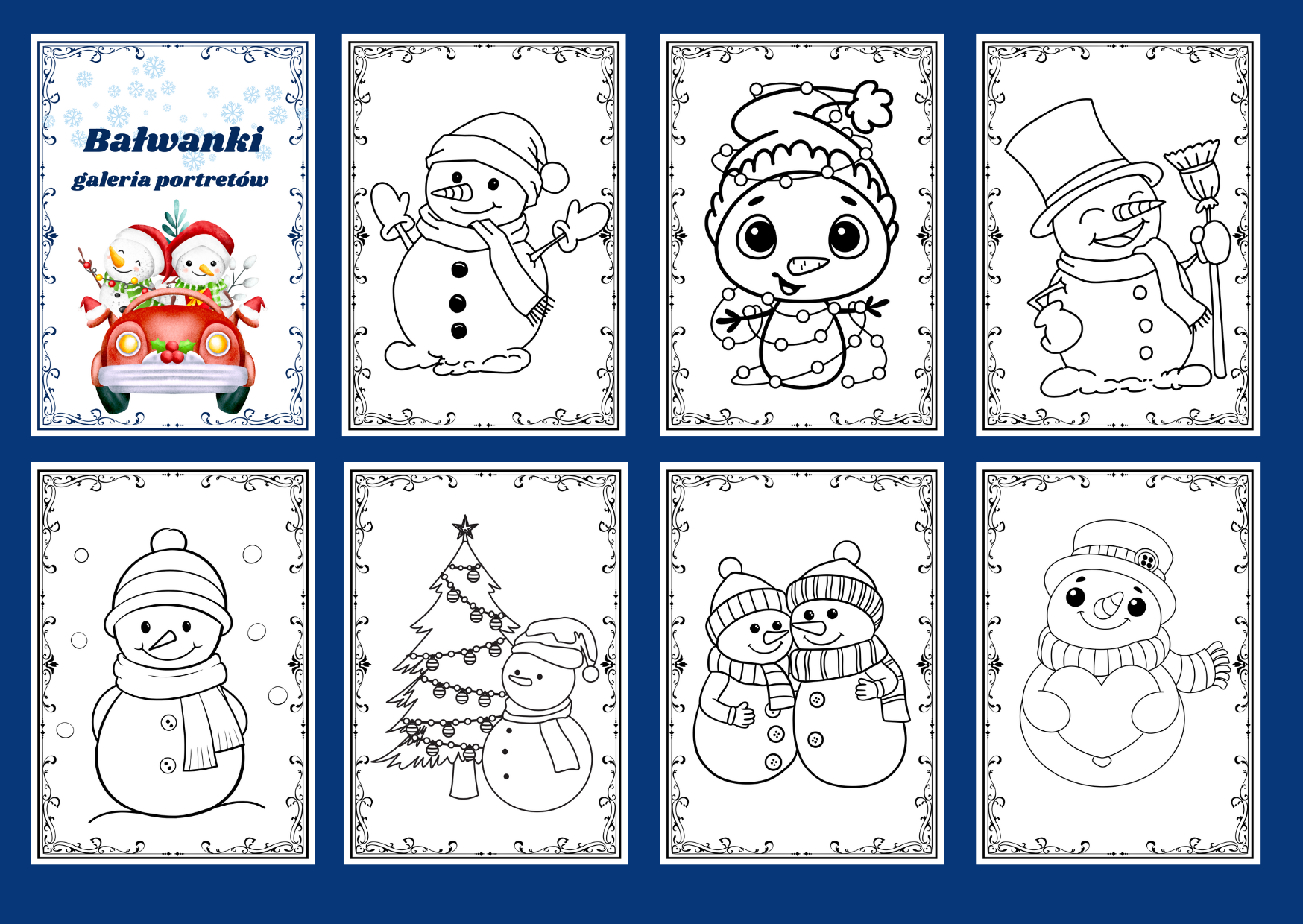 Materiał zawiera 45 kolorowanki z bałwankami oraz stronę tytułową i pustą kartę z ramką. Po pomalowaniu przez dzieci kolorowanek, można stworzyć gazetkę – klasową galerię portretów bałwanków.