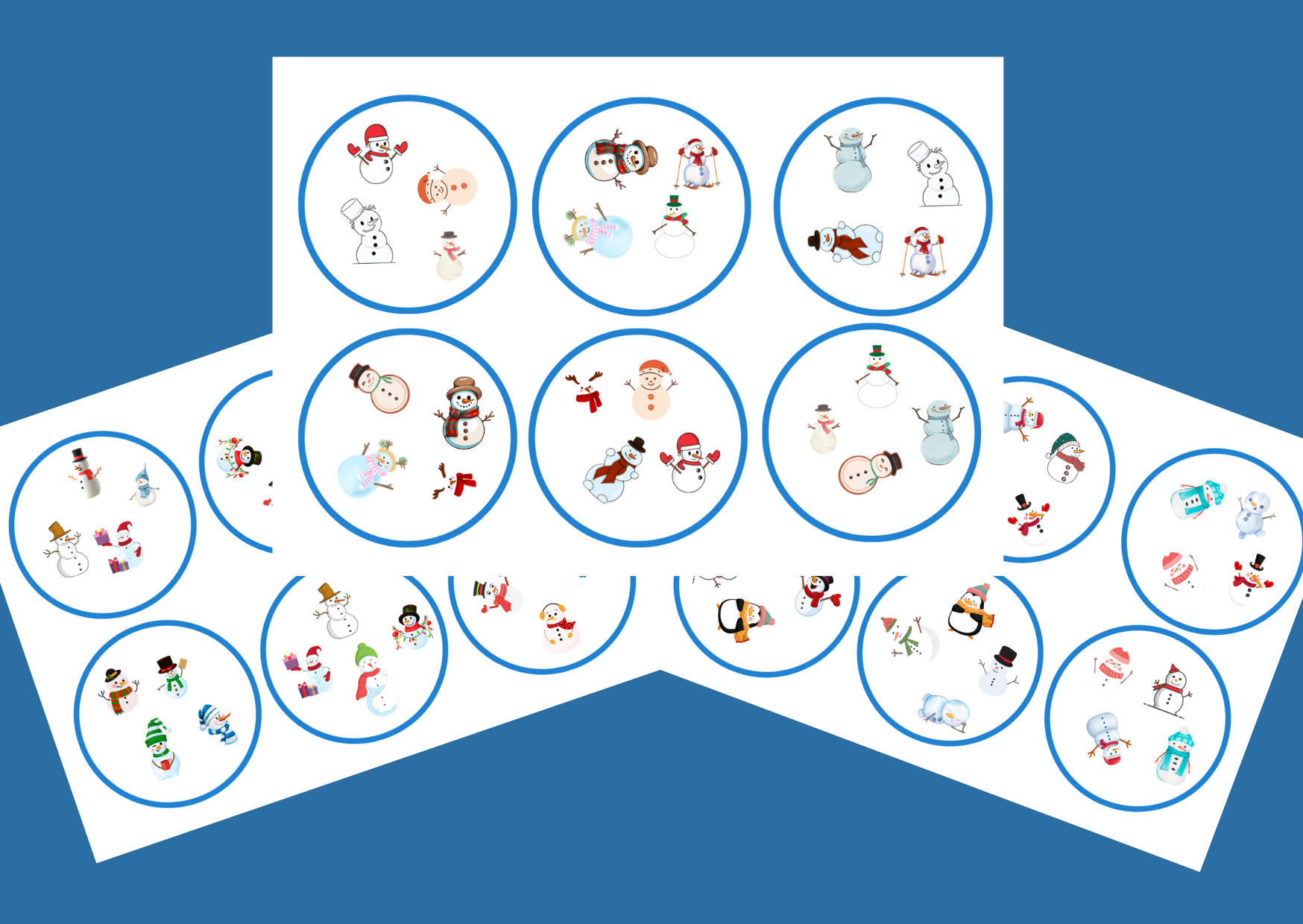 Zestaw zawiera 6 kart w wersji kolorowej. Na każdej karcie znajduje się 6 kół z obrazkami przedstawiającymi bałwanki. Po wycięciu materiał można zalaminować, aby dłużej służył.  Grafiki wykorzystane w dooble pochodzą z aplikacji Canva oraz  pixabay.