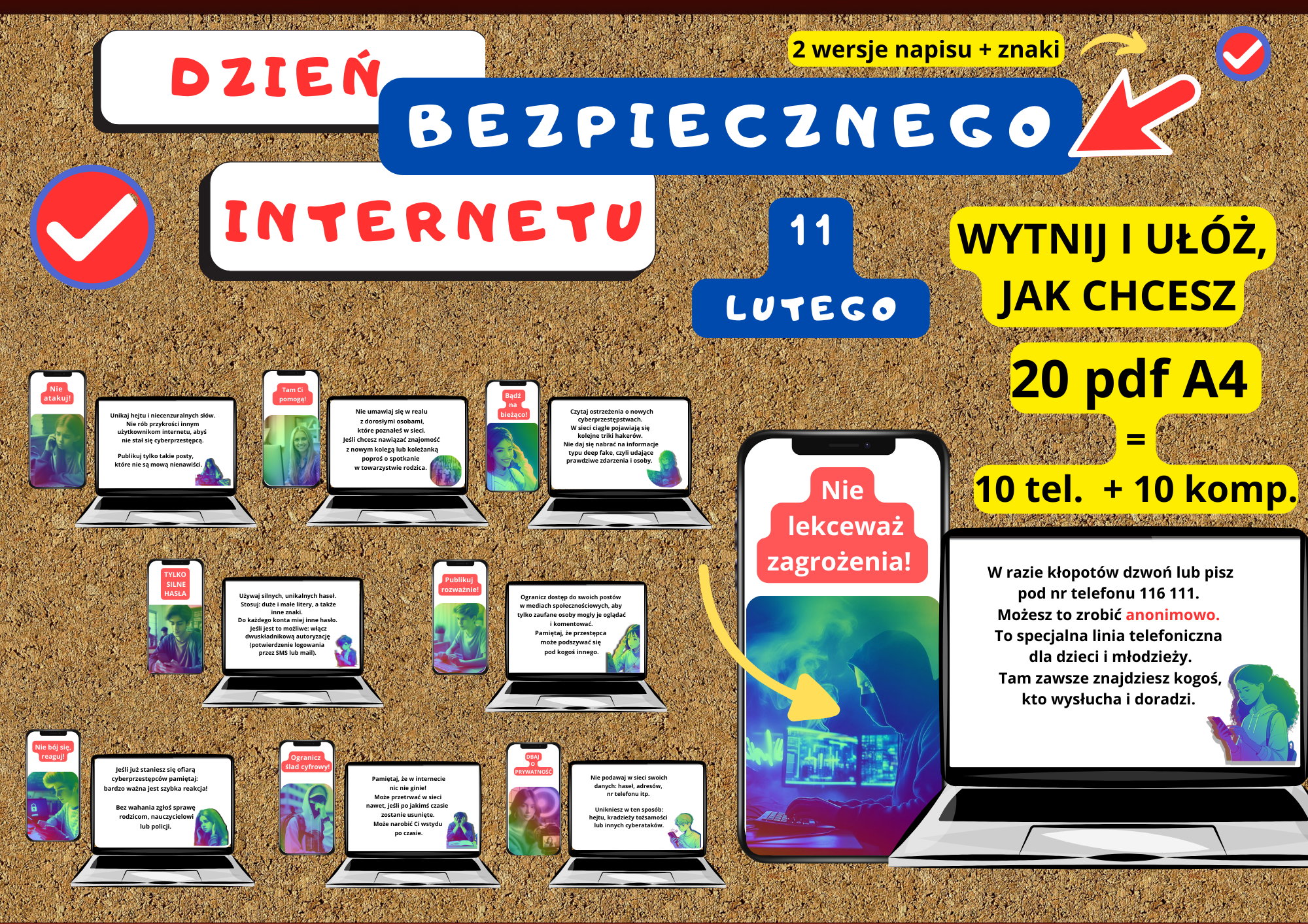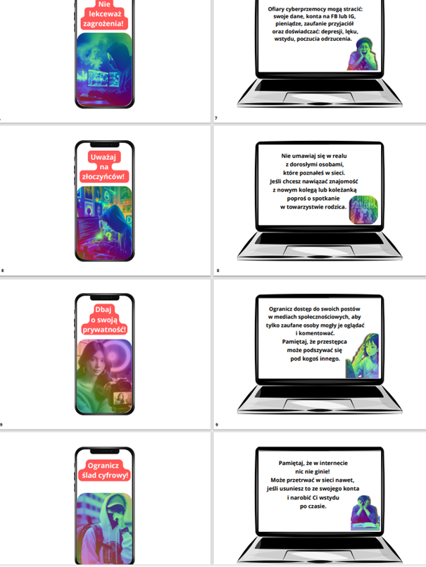 💻 Uczniowie dowiedzą się z niej — jak działają cyberprzestępcy, gdzie szukać pomocy, czego unikać, jak zabezpieczyć swoje dane. Napisy i ozdobniki w 2 wersjach kolorystycznych.
