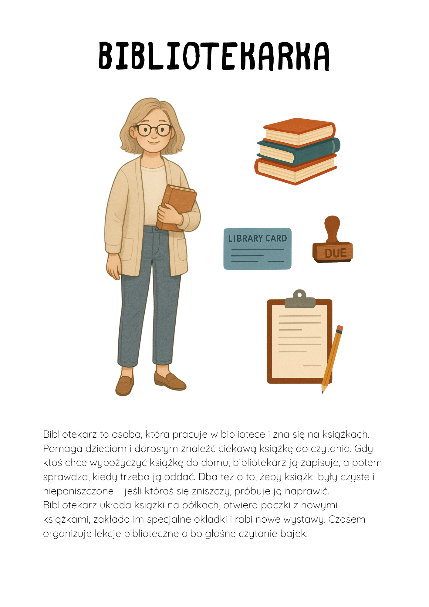 Zestaw „Dzień Bibliotekarza i Bibliotek” do druku został stworzony z myślą o przedszkolach oraz uczniach młodszych klas szkoły podstawowej. To gotowe materiały, które pomogą w atrakcyjny sposób przeprowadzić zajęcia tematyczne, promować czytelnictwo oraz zapoznać dzieci z zasadami korzystania z biblioteki. W skład zestawu wchodzą: 🎈 Dekoracje ✔ Girlanda w kształcie książek z napisem – idealna do udekorowania sali lub biblioteki ✔ Zestaw ilustracji dekoracyjnych do stworzenia kącika czytelniczego 📘 Materiały edukacyjne ✔ Ilustracje z opisami: bibliotekarka/bibliotekarz, karta biblioteczna, biblioteka, budowa książki ✔ Gotowe grafiki edukacyjne do gazetki lub rozmów z dziećmi 🎲 Gry i zabawy ✔ Gra „Dopasuj postać/element do okładki książki” – rozwija spostrzegawczość i znajomość bohaterów literackich ✔ Gra „Ja mam, kto ma?” – z motywami biblioteki, książek i bajkowych postaci ✔ Lista zasad zachowania w bibliotece + quiz sprawdzający ich zrozumienie 📝 Karty pracy ✔ Wyszukiwanie liter na ilustracjach ✔ Projektowanie własnej okładki książki ✔ Uzupełnianie brakujących liter ✔ Książkowe sudoku ✔ Układanie liter w kolejności i odkrywanie obrazka