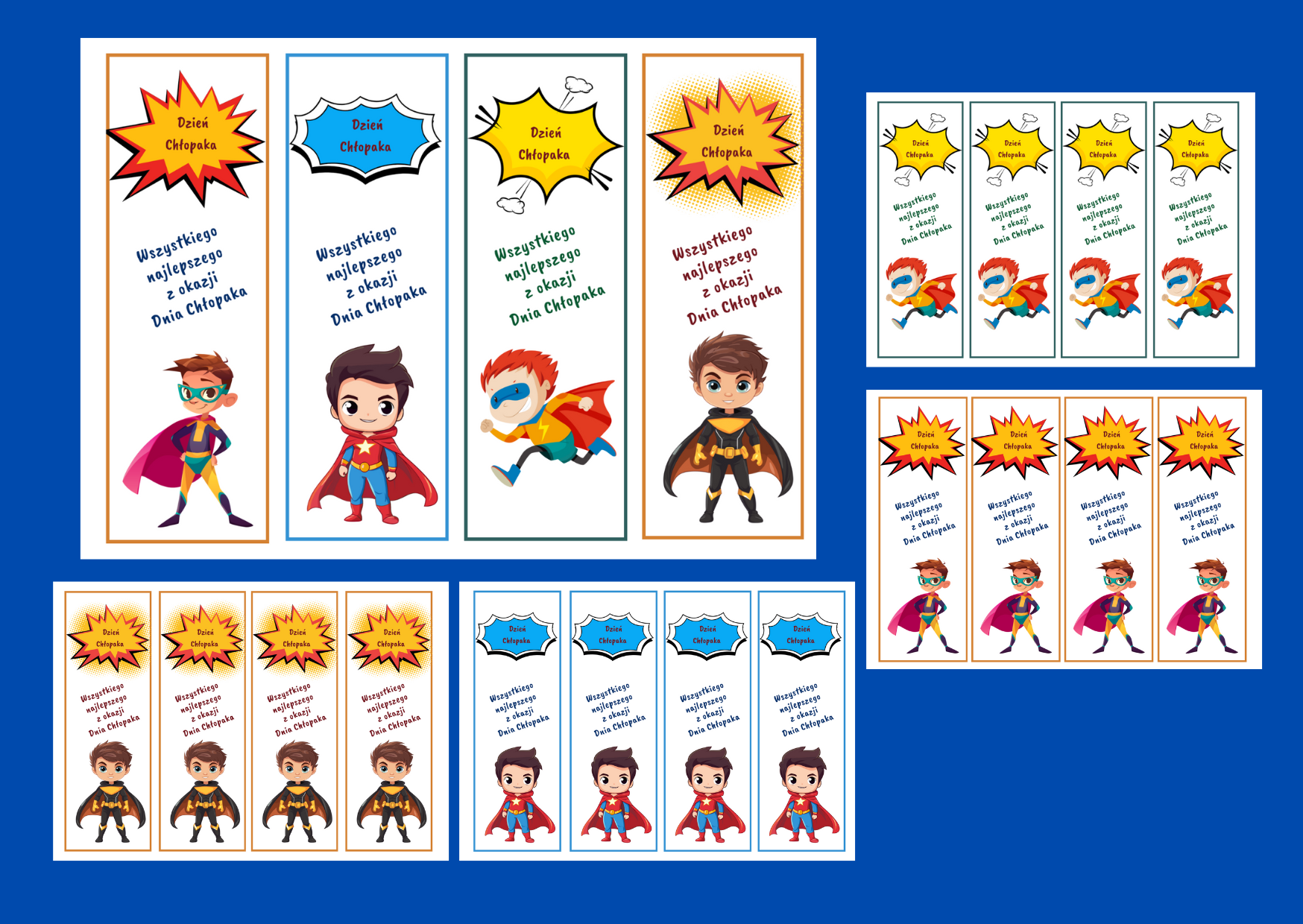 4 wersje zakładek do książek z okazji Dnia Chłopaka. Po wydrukowaniu i wycięciu zakładki warto zalaminować ( ewentualnie wydrukować na grubszym papierze).