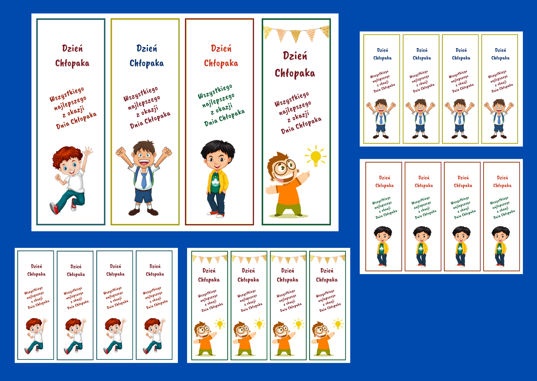 4 wersje zakładek do książek z okazji Dnia Chłopaka. Po wydrukowaniu i wycięciu zakładki warto zalaminować ( ewentualnie wydrukować na grubszym papierze).