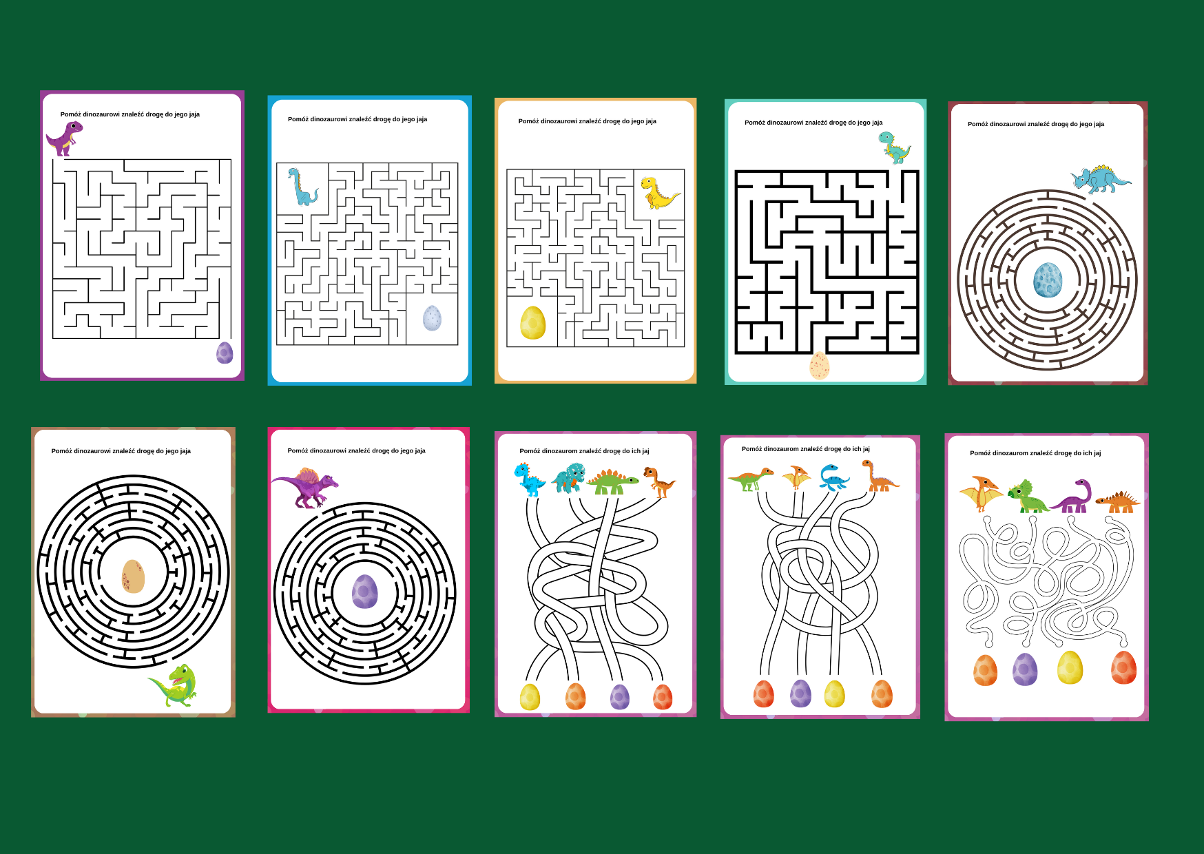 Zestaw labiryntów idealnych na Dzień Dinozaura i nie tylko. 10 wersji o różnym poziomie trudności, każdy w formacie A4 (można oczywiście zmniejszyć format podczas drukowania).