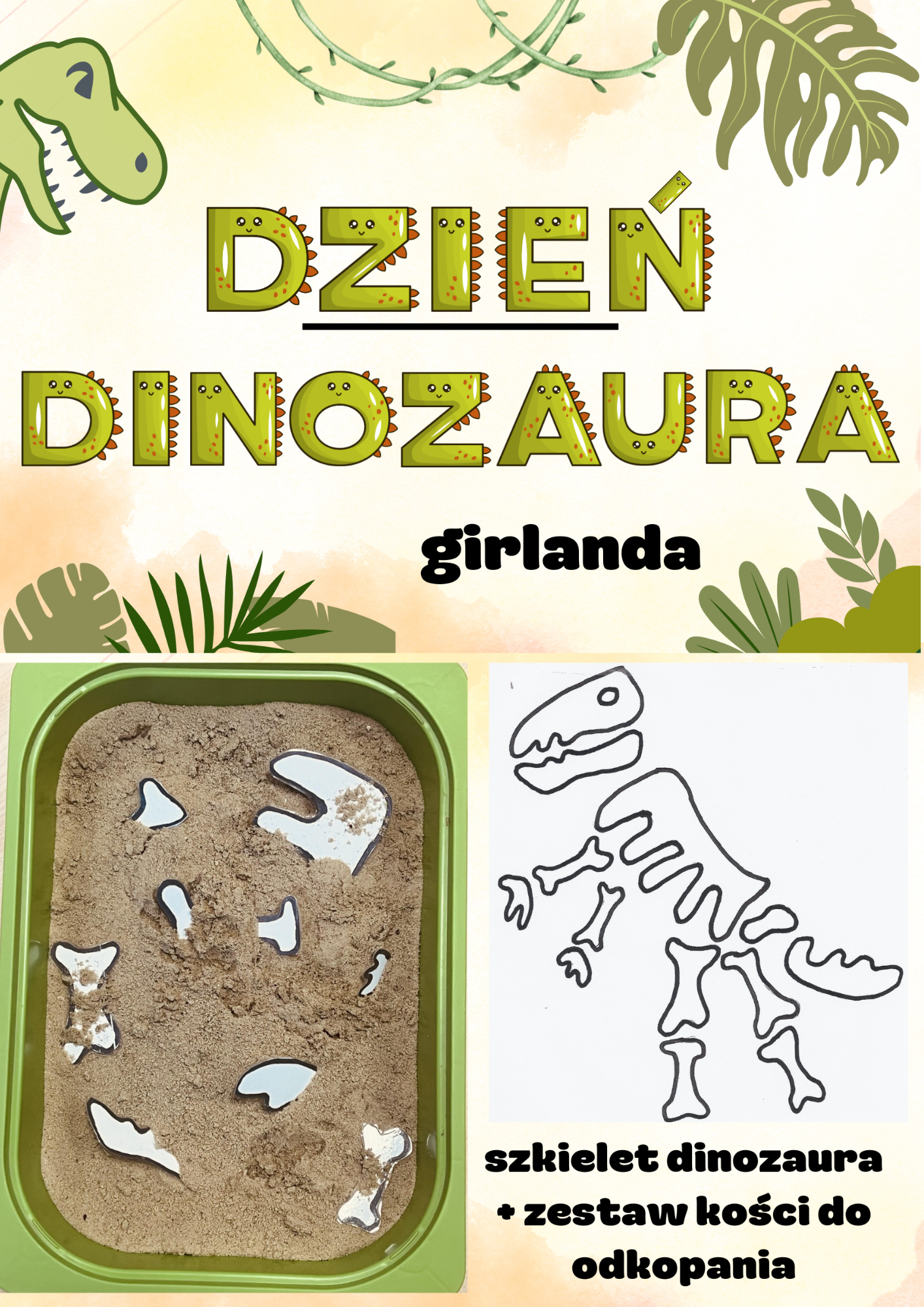 Do zabawy wystarczy jedynie pudełko wypełnione piaskiem! Dzieci będą mogły całą grupą odkopywać elementy, a następnie przyporządkowywać je do szkieletu dinozaura.