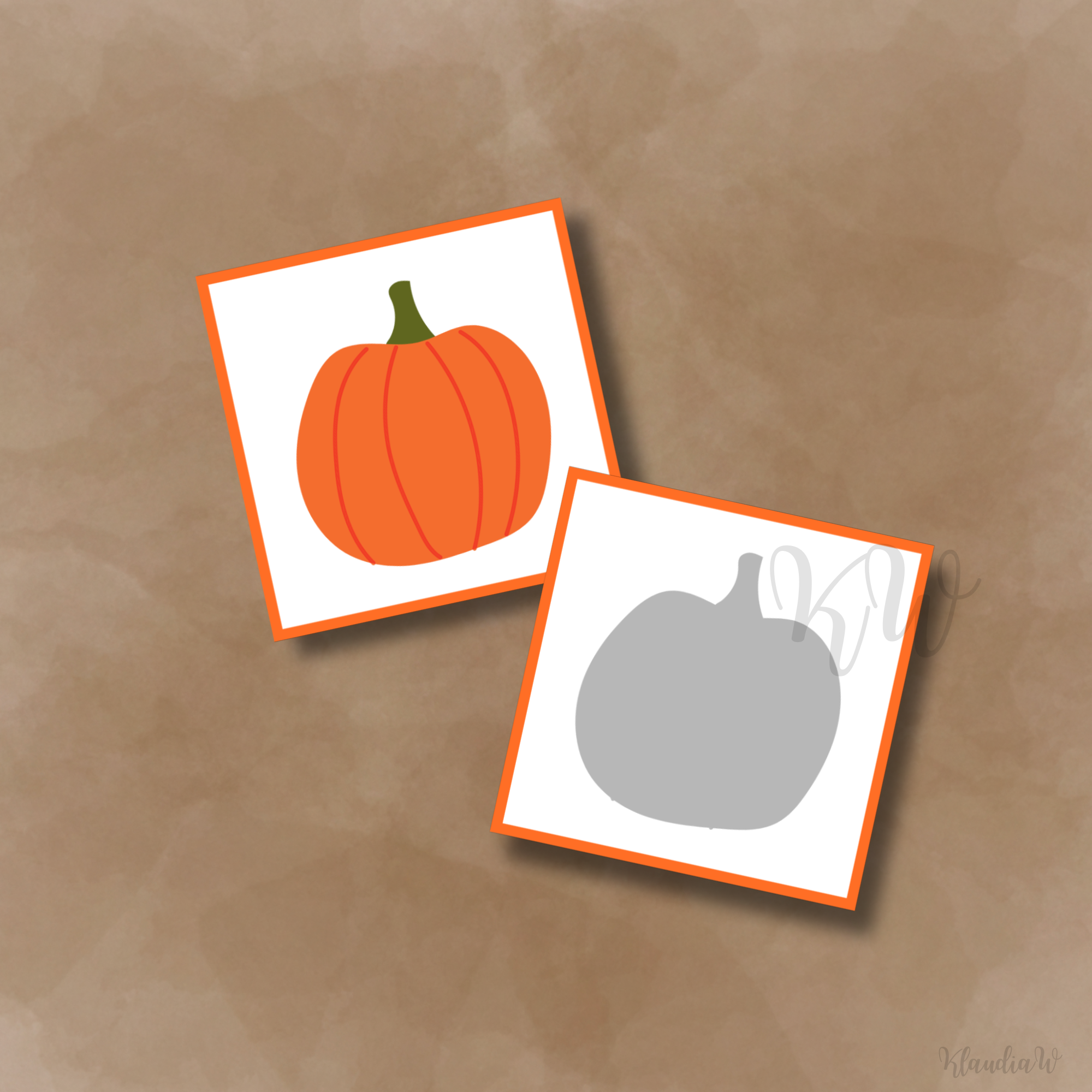 Zestaw zawiera 24 pary obrazków z dyniami, gdzie jedna karta przedstawia dynię w kolorze, a druga jej cień. Obrazki są ułożone po 3 pary na stronie A4, gotowe do wycięcia i natychmiastowego użycia.