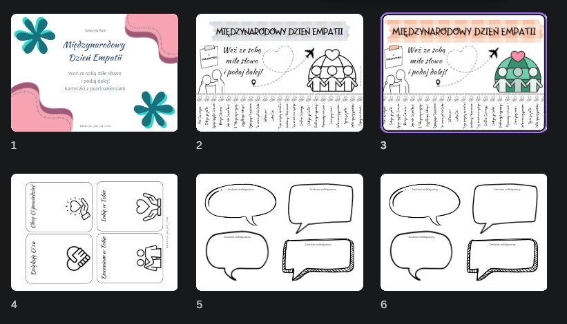 2 arkusze (czarno-biały i kolorowy) z miłymi słowami do zrywania na dzień empatii.