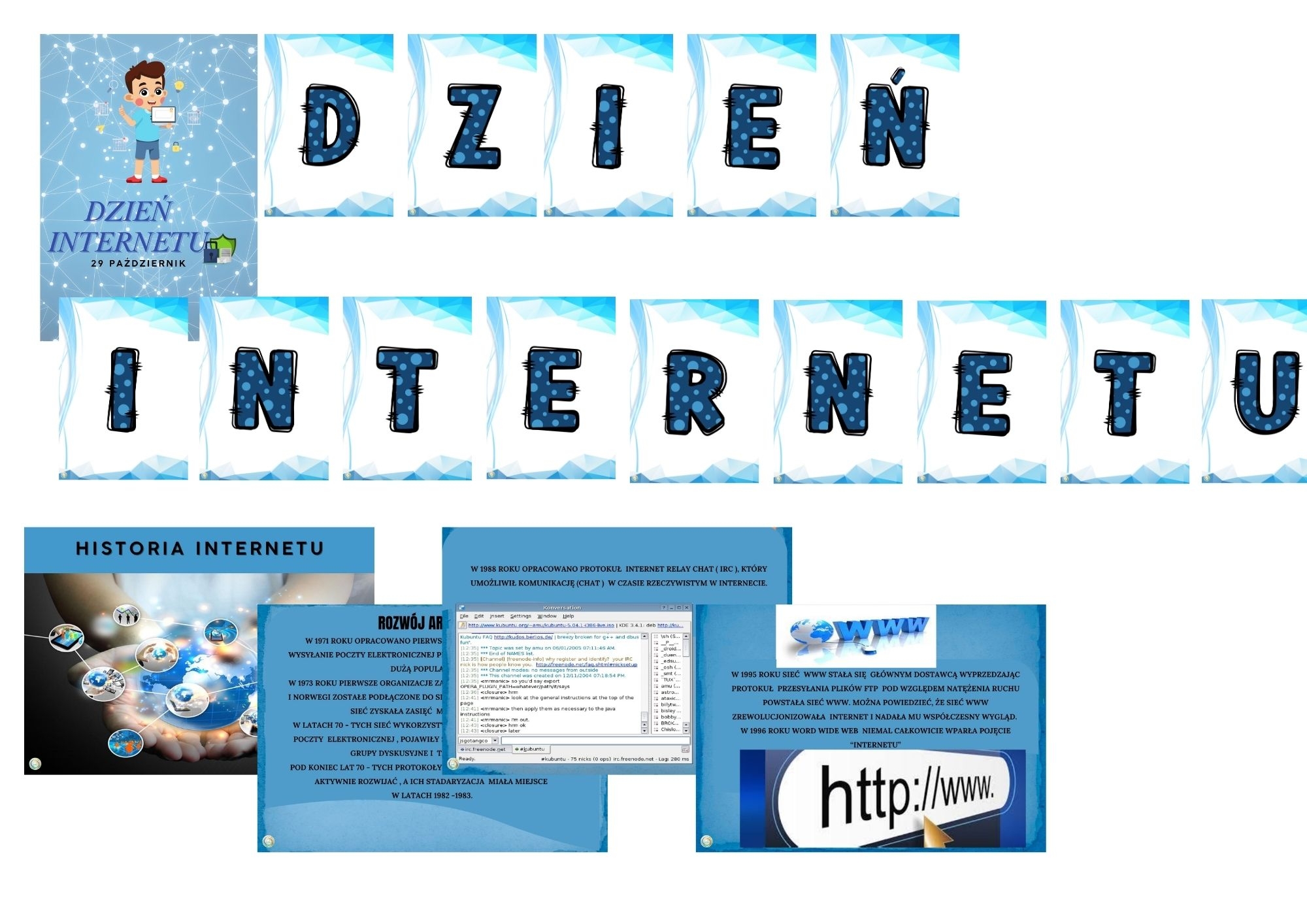 Zestaw „Dzień Internetu” to komplet atrakcyjnych, edukacyjnych kart pracy stworzonych z myślą o najmłodszych użytkownikach sieci. Materiały wprowadzają dzieci w świat Internetu w bezpieczny i przyjazny sposób — poprzez zabawę, kolorowanie i proste zadania rozwijające logiczne myślenie oraz świadomość cyfrową.