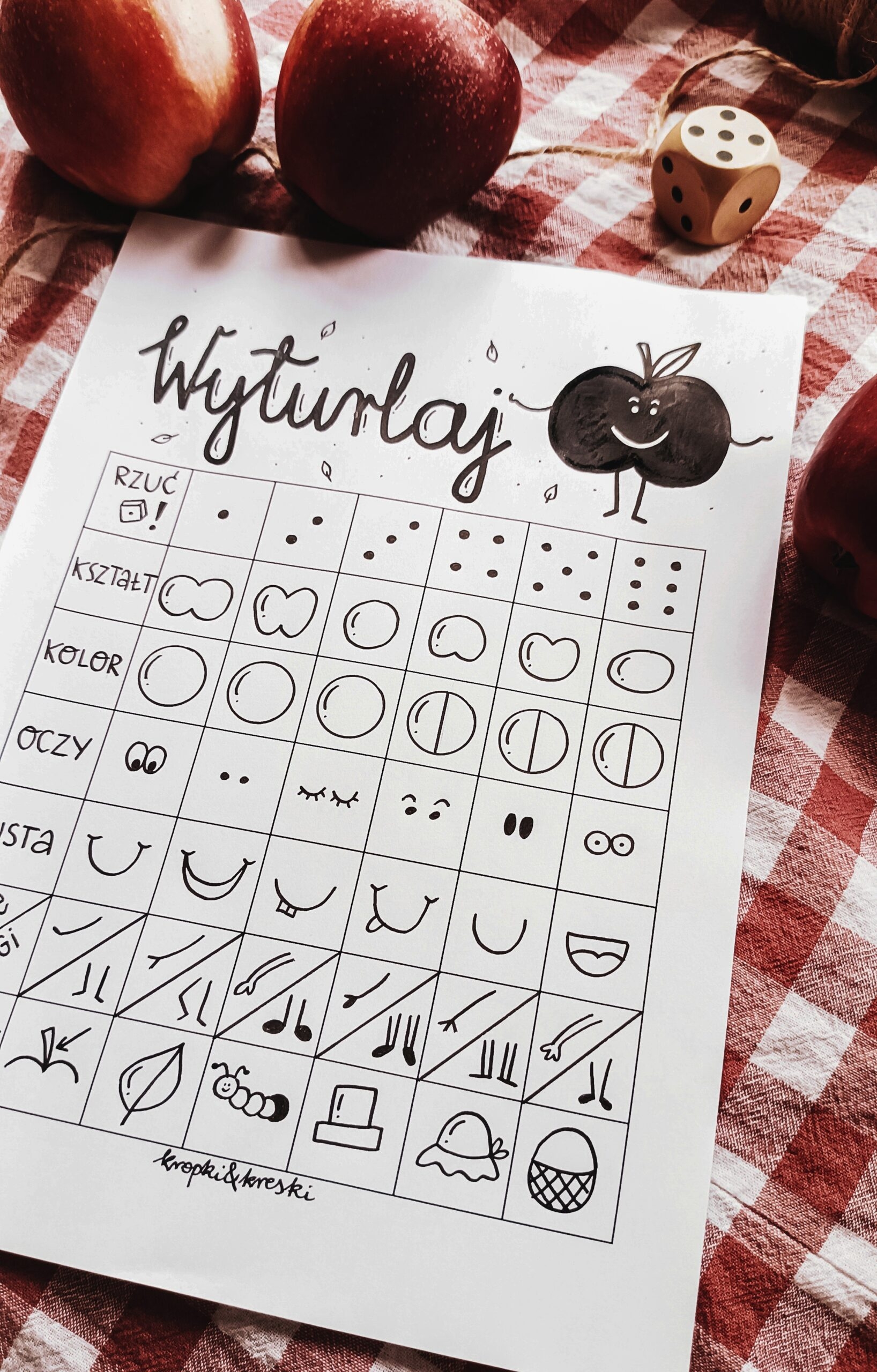 Plansza do gry typu “turlanka” czyli rzuć i narysuj. Tym razem z okazji Dnia Jabłka!🙂 Zabawa najlepiej sprawdzi się w małych grupach lub podczas zajęć indywidualnych. Do zabawy potrzebna jest plansza do gry, kostka oraz kartka i kredki. Gracze kolejno rzucają kostką – każdy rysuje wylosowany element z danej kategorii. W kolejnych rundach dorysowują kolejne części – sprawdzają na planszy element przypisany do danej liczby oczek. W tej grze każdy jest zwycięzcą!🙂