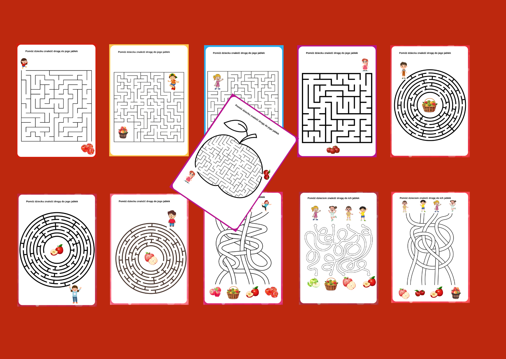 Zestaw labiryntów związanych z Dniem Jabłka. 11 wersji o różnym poziomie trudności, każdy w formacie A4 (można oczywiście zmniejszyć format podczas drukowania).