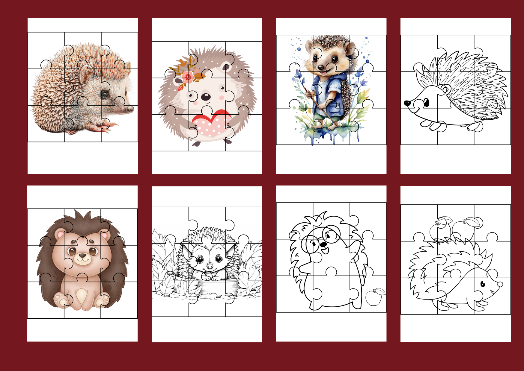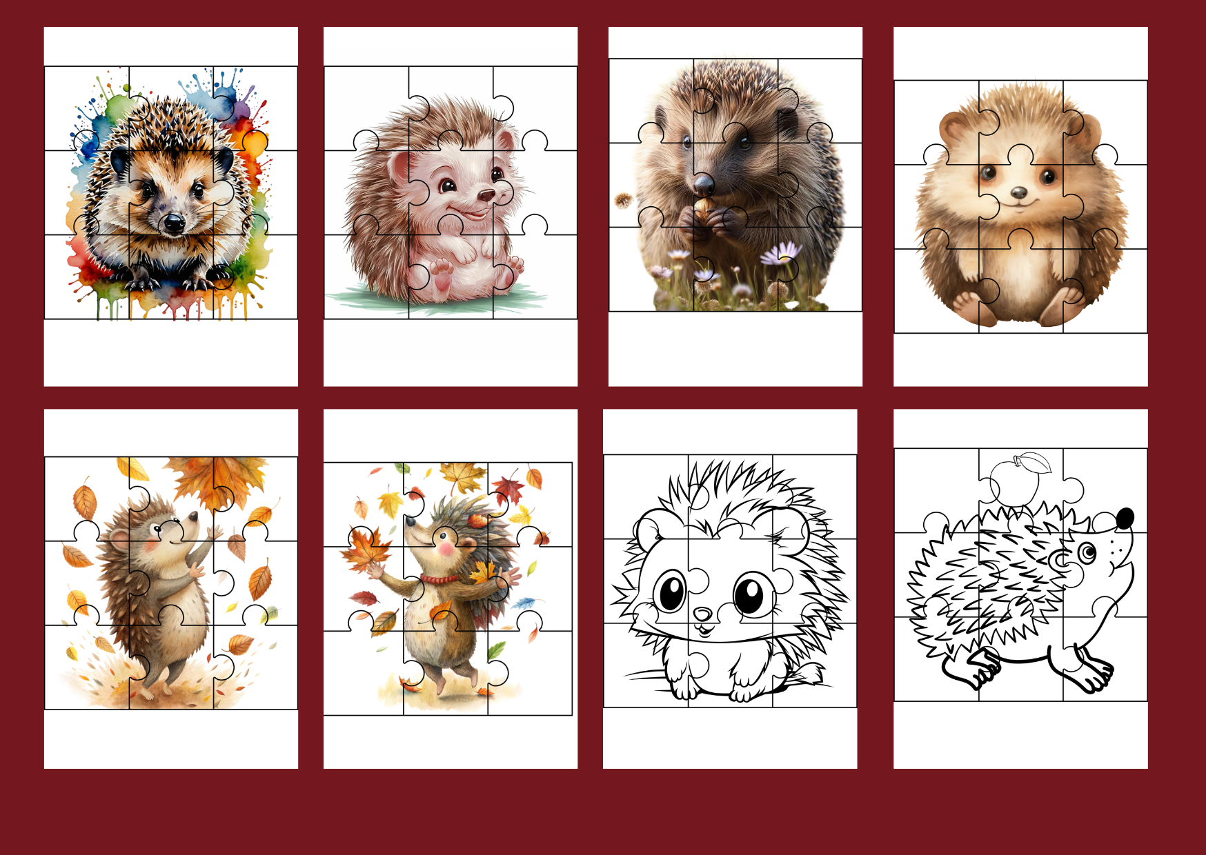Zestaw 17 puzzli do wydruku (format A4) - 7 czarno-białych (przed wycięciem można je pokolorować) i 10 kolorowych.