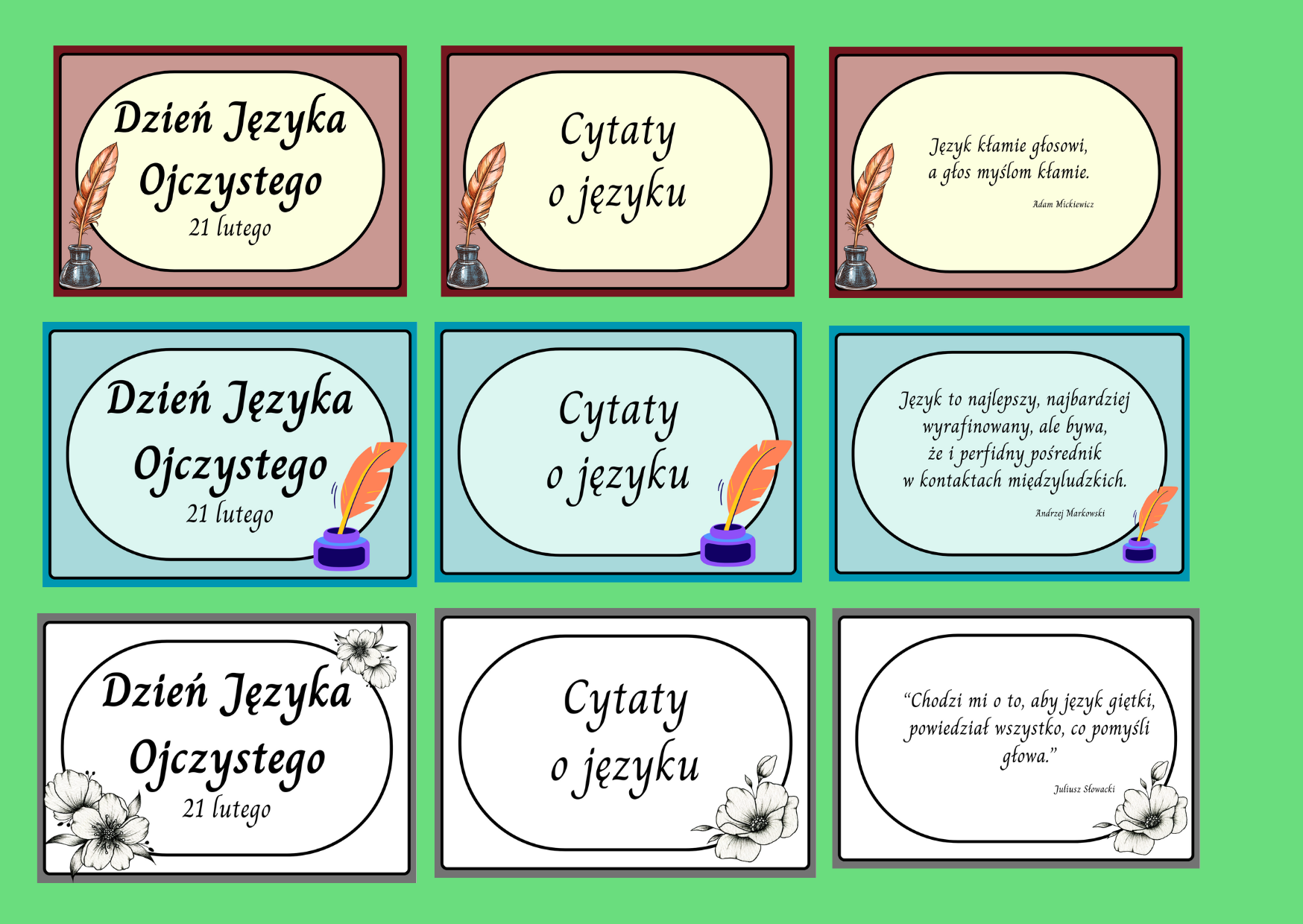 Gazetka pt. „Dzień Języka Ojczystego” – składa się z 21 stron A4 pdf do wydruku. Na kartkach znajdują się cytaty dotyczące języka - słowa znanych poetów, pisarzy i filozofów.