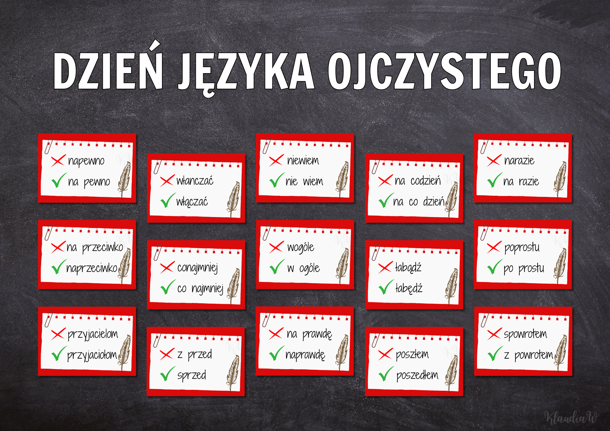 Gazetka na Międzynarodowy Dzień Języka Ojczystego – 21 lutego Zainspiruj uczniów do codziennej troski o poprawność językową! W pliku PDF znajdziesz: - 17 plansz z typowymi błędami językowymi i ich poprawnymi wersjami, - literki do stworzenia napisu „DZIEŃ JĘZYKA OJCZYSTEGO” (ok. 11 cm wysokości).