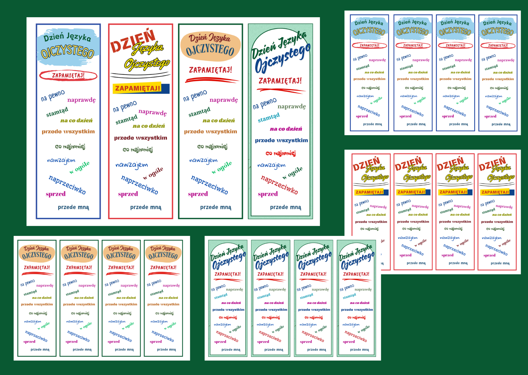 Zestaw 4 rodzajów zakładek do książek, na każdej zamieszczone są poprawne formy wyrazów często używanych. Składa się z 5 stron: na pierwszej stronie zamieszczony jest zestaw 4 zakładek, pozostałe strony przeznaczone są dla poszczególnych wersji. Warto po wydrukowaniu i wycięciu zakładki zalaminować ( ewentualnie wydrukować na grubszym papierze).