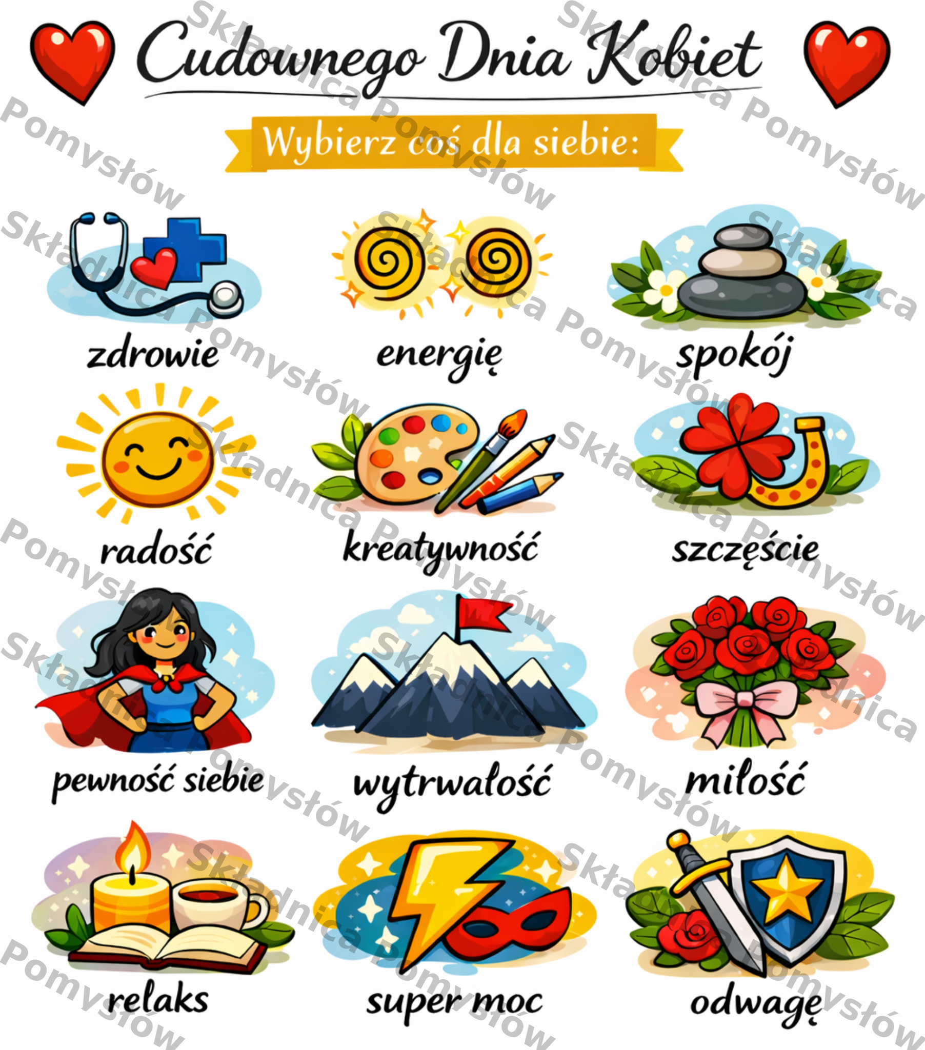 Wydrukuj wybraną stronę w formacie A4. Wersję kolorową można wykorzystać jako kartę okolicznościową, dekorację sali, element gazetki lub inspirację do rozmowy podczas zajęć. Wersję do kolorowania dzieci mogą samodzielnie ozdobić, a następnie wskazać lub omówić wybrane wartości i symbole. Materiał dobrze sprawdzi się jako krótka aktywność tematyczna, praca plastyczna, przerywnik na zajęciach lub dodatek do obchodów Dnia Kobiet.