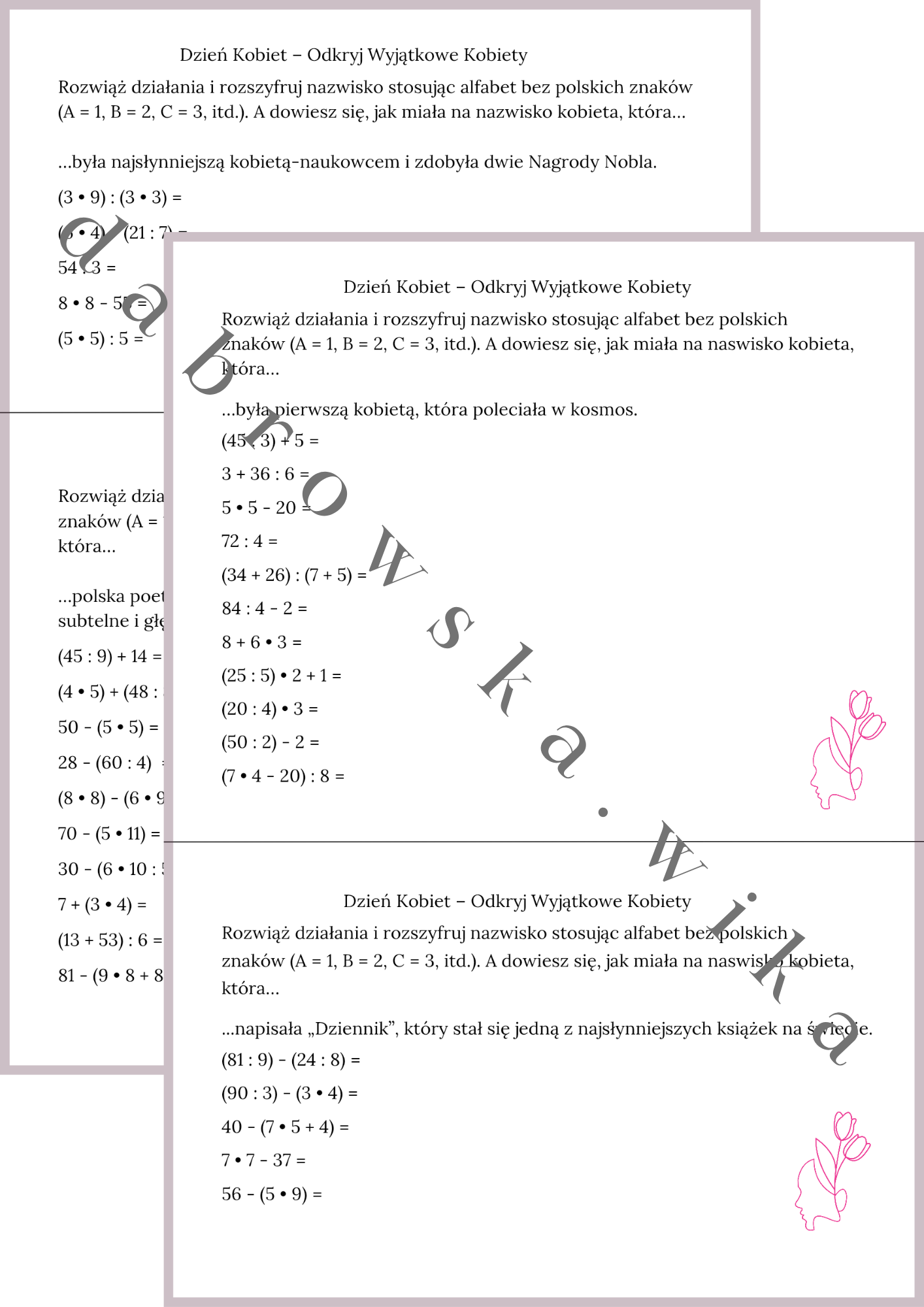 Każde z dziesięciu zadań to matematyczna łamigłówka – rozwiązując działania, uczniowie otrzymają liczby, które odpowiadają literom w alfabecie (A = 1, B = 2, C = 3 itd.). Po rozszyfrowaniu nazwiska poznają inspirujące postacie i ich osiągnięcia. Dzięki temu uczniowie nie tylko ćwiczą umiejętności matematyczne, ale również zdobywają wiedzę o kobietach, które zmieniły świat.