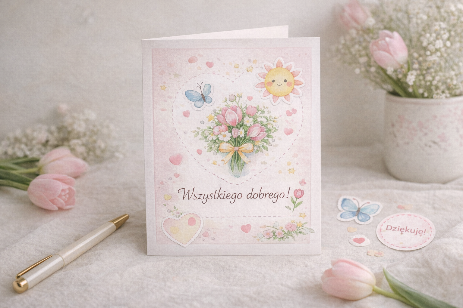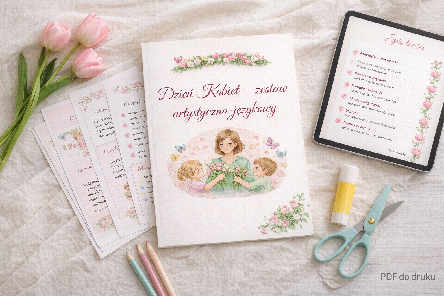 Ten zestaw to gotowy pakiet na Dzień Kobiet: połączenie języka, kreatywności i plastyki w jednej spójnej, pięknie ozdobionej publikacji PDF.