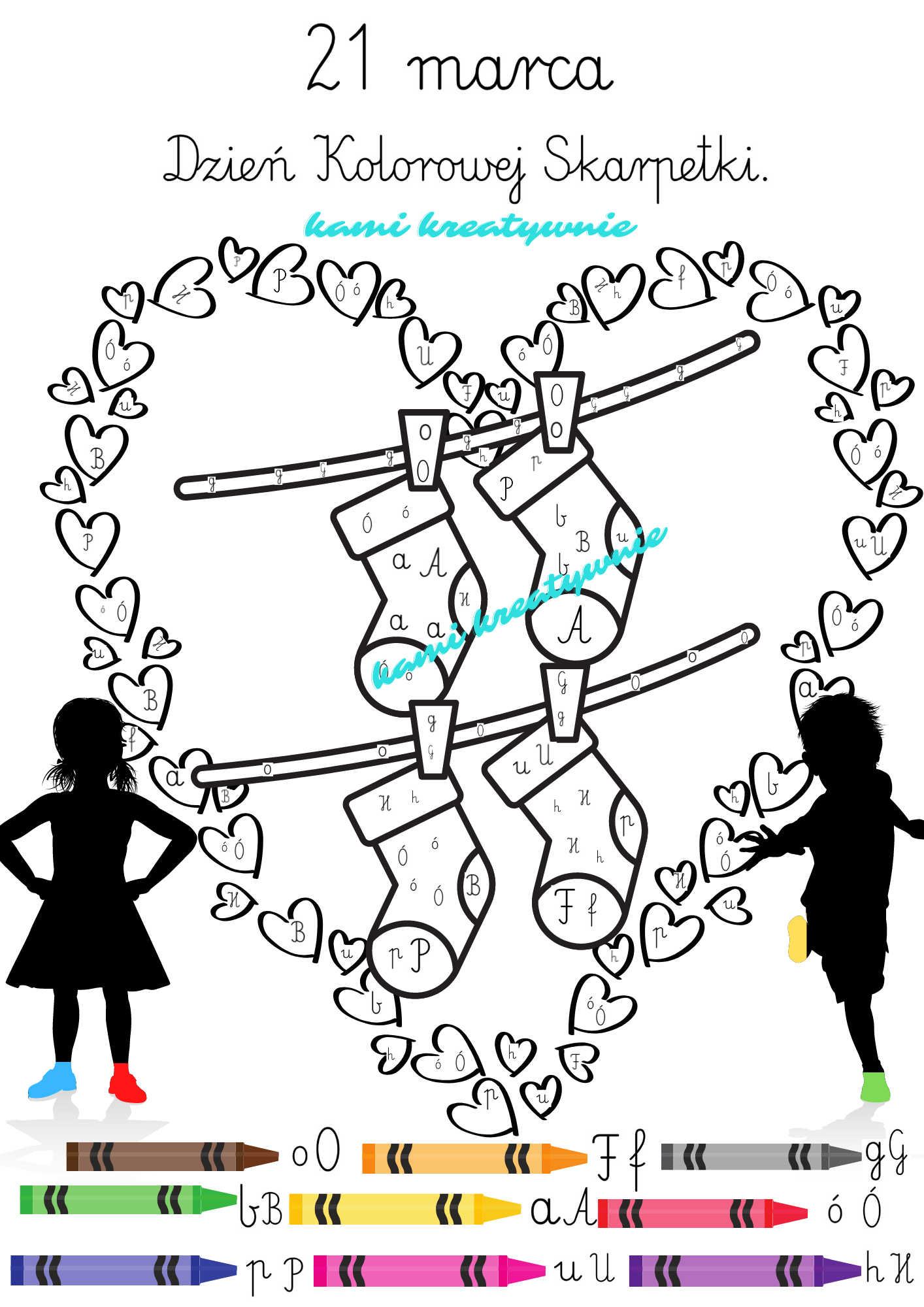 Materiał na Dzień Kolorowej Skarpetki zawiera plakat xxl- 16 kartek plus karta a4 do pokolorowania według wzoru- litery