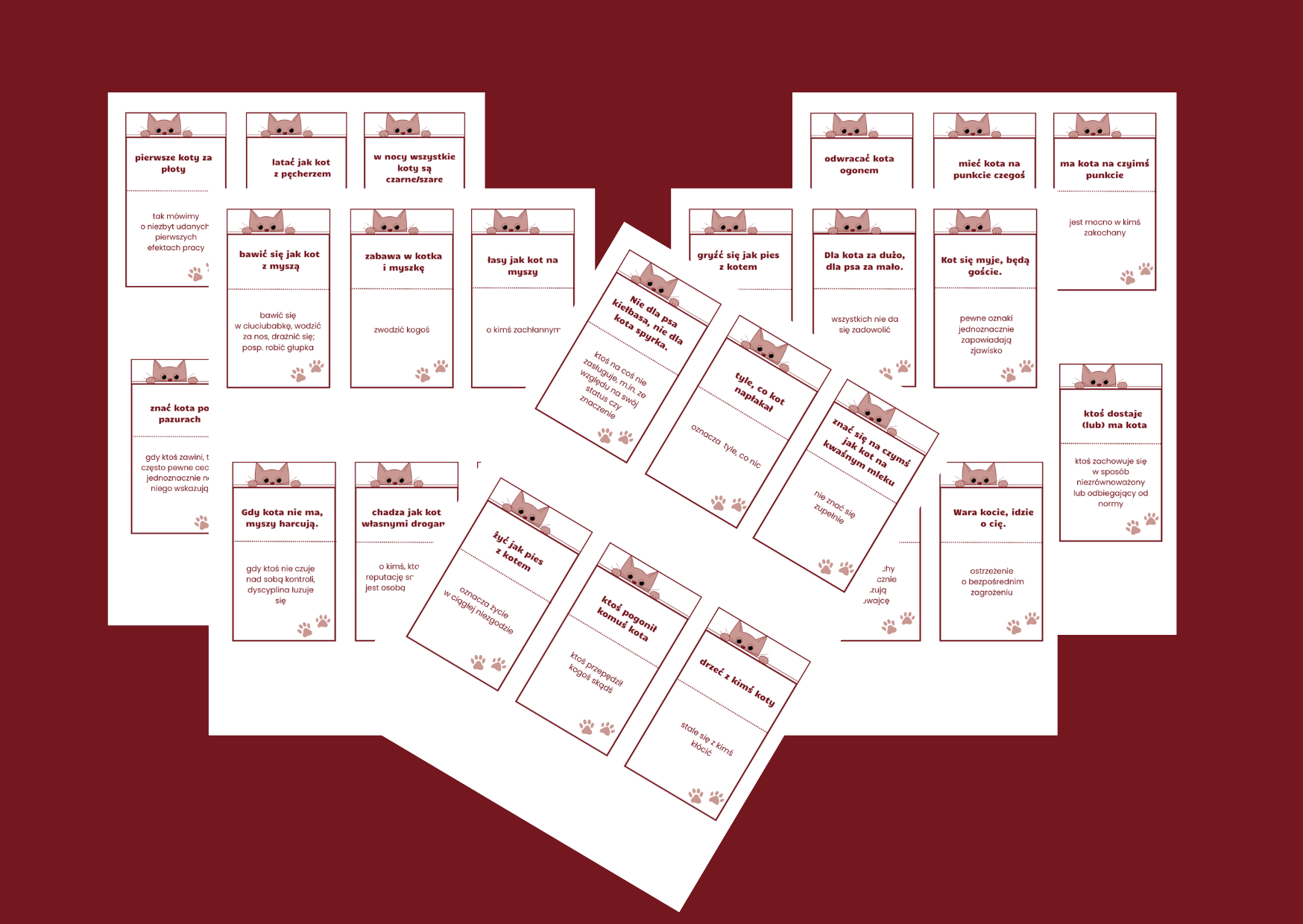 Materiał zawiera 5 stron z fiszkami ( 30 fiszek), które dotyczą frazeologizmów i przysłów ze słowem „kot”. Fiszki należy wyciąć (przedtem można je zalaminować, by dłużej posłużyły).