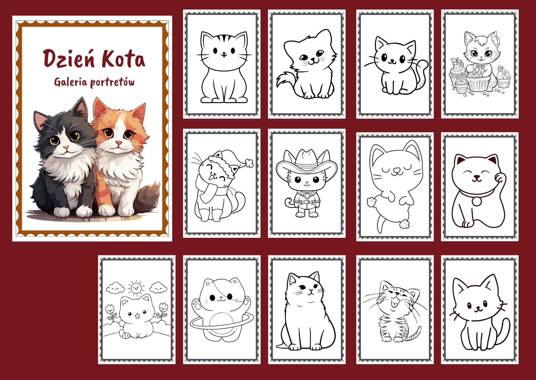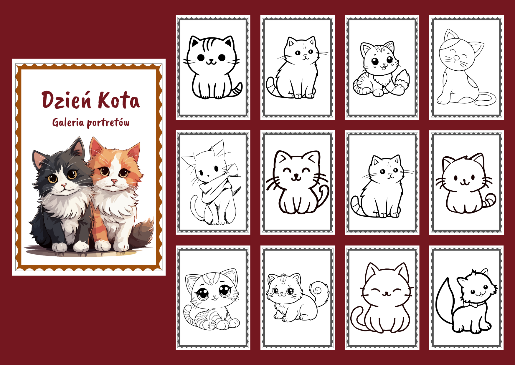 Materiał zawiera 25 kolorowanek z kotkami oraz stronę tytułową i pustą kartę. Po pomalowaniu przez dzieci kolorowanek, można stworzyć gazetkę – klasową galerię portretów kotków. Wszystkie karty mają format A4.