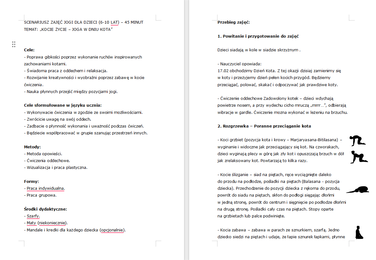 Zapraszam do pobrania kompletnego scenariusza zajęć jogi, stworzonego specjalnie z myślą o Międzynarodowym Dniu Kota. Materiał jest idealnie dopasowany do potrzeb dzieci w wieku przedszkolnym i wczesnoszkolnym (6–10 lat). Scenariusz zawiera cele, metody, formy i środki. Zajecia przeznaczone są na 45 min i składają się z rozgrzewki, części głownej oraz krótkiej relaksacji plus kolorowanki - kociej mandali.
