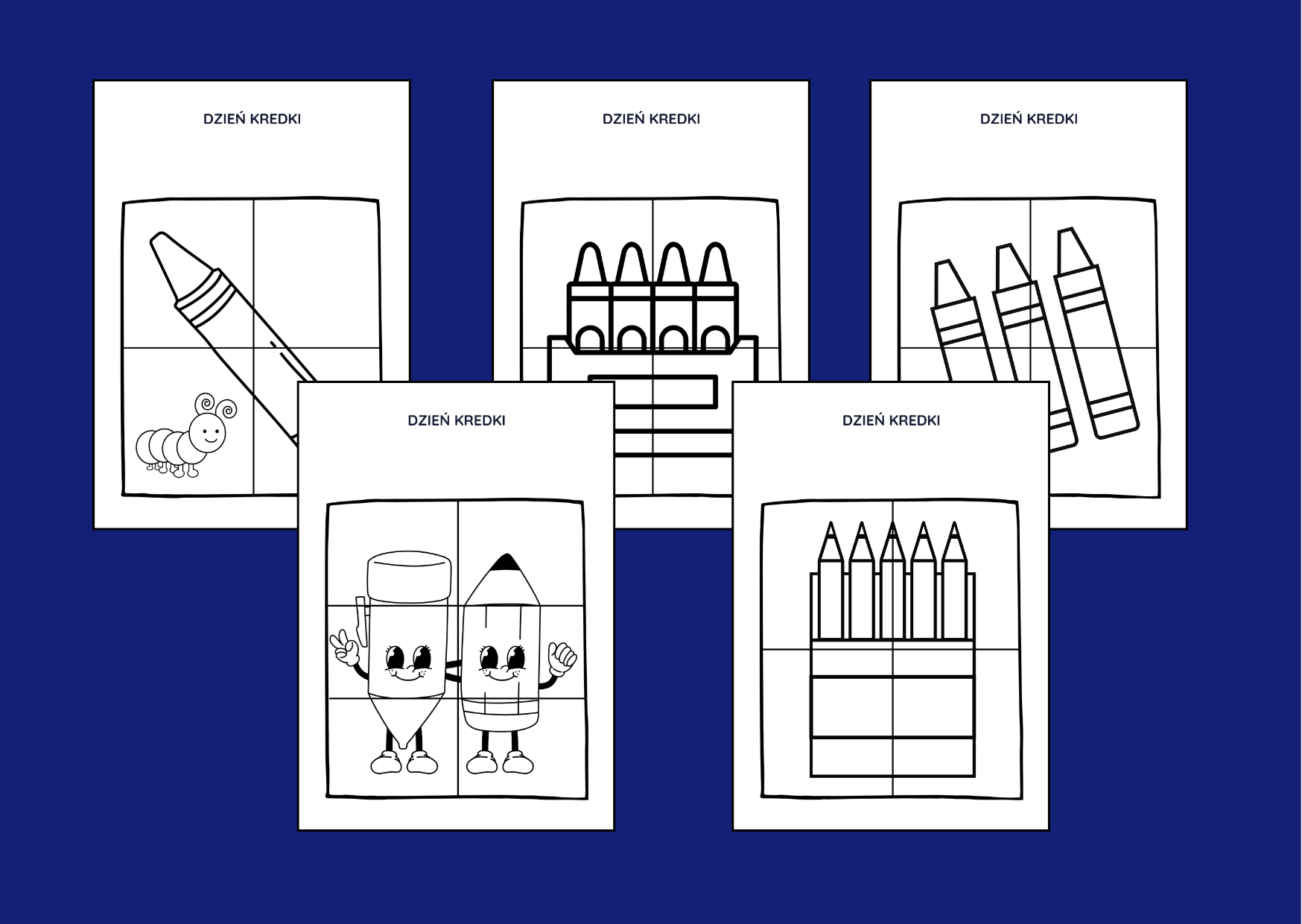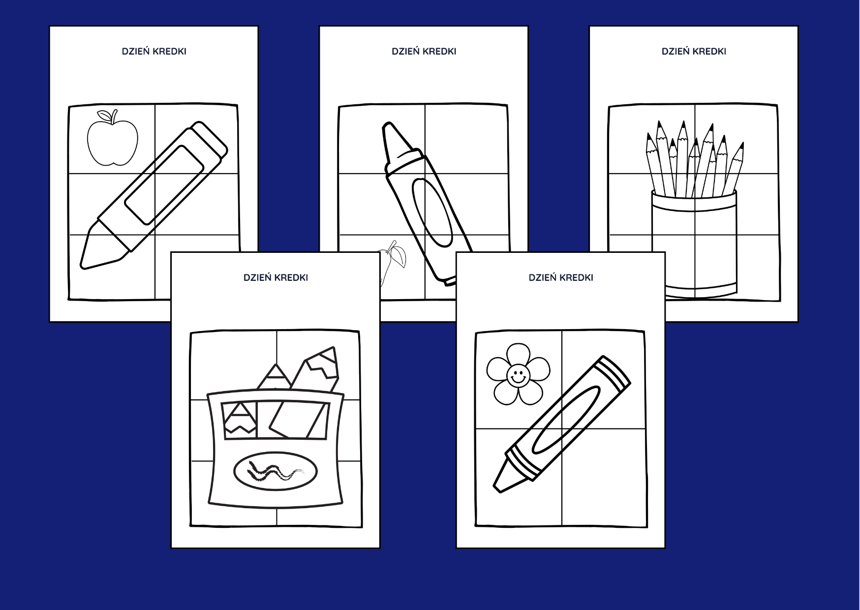 Zestaw zawiera 10 układanek w wersji czarno-białej z kredkami (5 z puzzlami po 4 części i 5 po 6 części). Przed wycięciem dzieci mogą je pokolorować, a po wycięciu materiał można zalaminować, aby dłużej służył. Materiał przeznaczony dla młodszych dzieci.