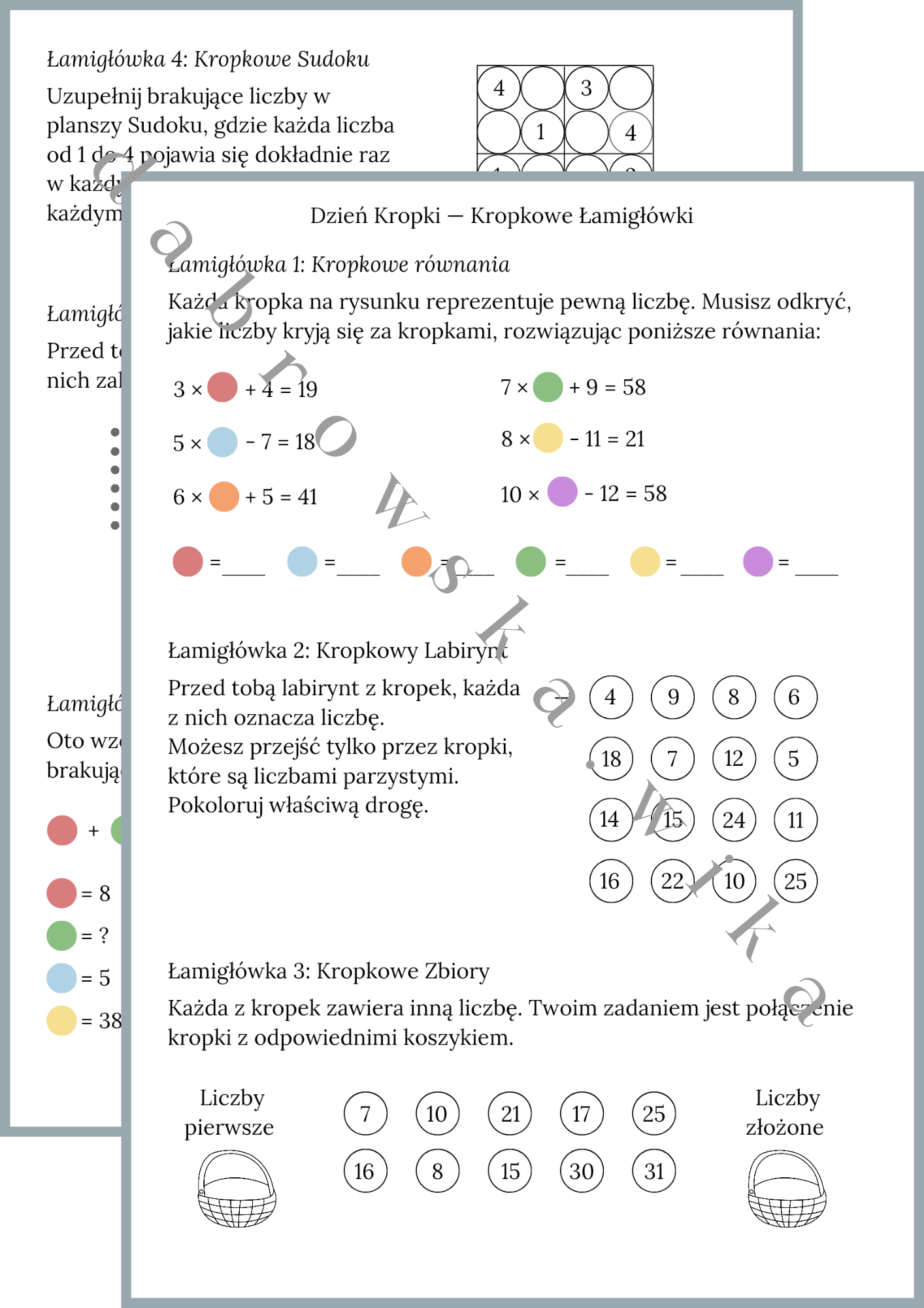 Karta pracy zawiera różnorodne łamigłówki matematyczne dotyczące m.in. dodawania, odejmowania, mnożenia, dzielenia, liczb parzystych i pierwszych oraz obwodów figur. Każde z zadań jest powiązane z tematem Dnia Kropki.