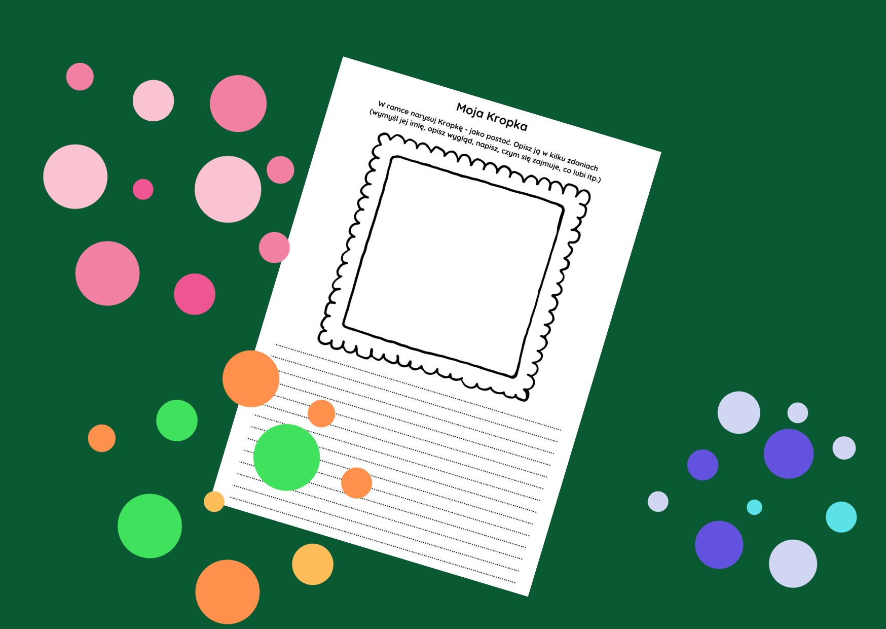 Karta pracy, którą można wykorzystać na lekcji. Zadanie ucznia polega na narysowaniu w ramce kolorowej kropki jako postaci, a następnie opisaniu jej.
