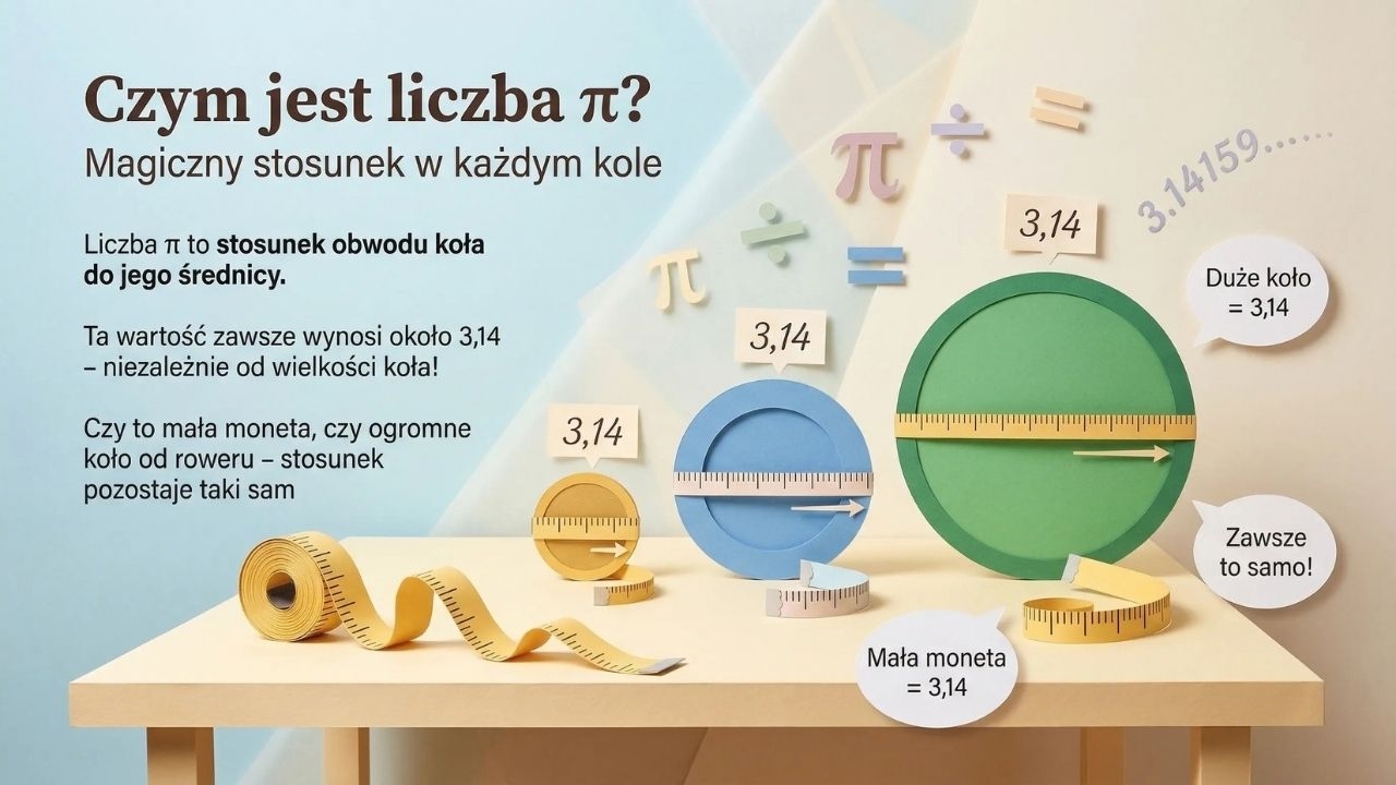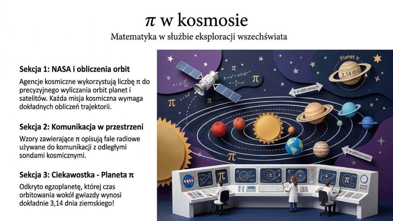 Jak pracować z materiałem? Możesz wydrukować plansze w A4/A3 i stworzyć pełną gazetkę na korytarzu, a na lekcji wykorzystać tylko wybrane slajdy (np. 2–4 jako wprowadzenie + 6 jako ciekawostka o Archimedesie + 14 jako mini-eksperyment). W wersji warsztatowej świetnie działa „rotacja stacji”: grupa 1 robi pi-emat, grupa 2 liczy własne π z taśmą mierniczą, grupa 3 rozwiązuje quiz, a na końcu klasa dzieli się efektami.