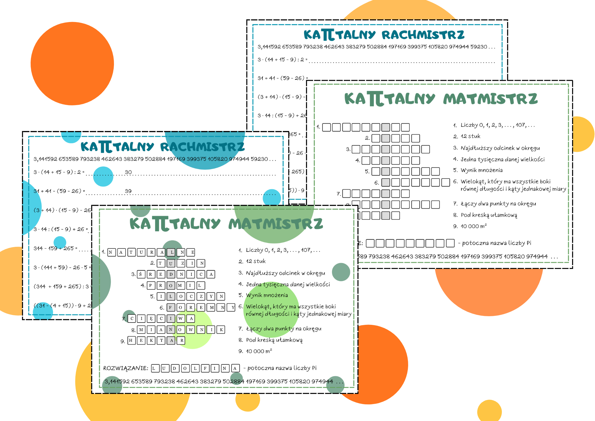 KaPi-talny Rachmistrz to propozycja dla klas 4 - 5 lub 4 - 6. 8 przykładów działań z wykorzytsaniem cyfr rozwinięcia dziesiętnego liczby Pi. Wymaga znajomości kolejności działań.